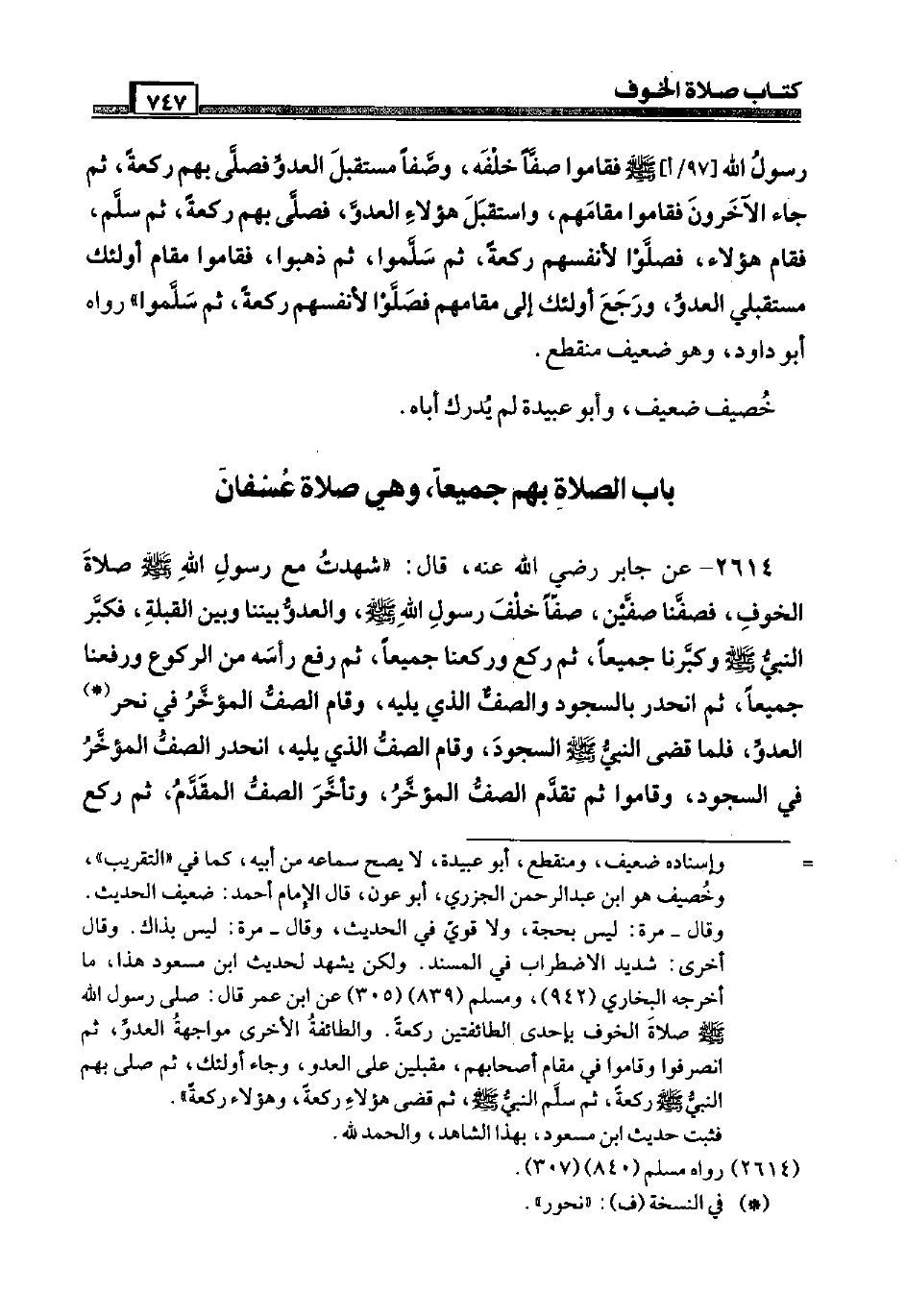 2614 - عَن جَابر رَضِيَ اللَّهُ عَنْه، قَالَ: " شهِدت مَعَ رَسُول الله صَلَّى اللَّهُ عَلَيْهِ وَسَلَّم َ صَلَاة الْخَوْف، فصفنا صفّين، صفا خلف رَسُول الله صَلَّى اللَّهُ عَلَيْهِ وَسَلَّم َ، والعدو بَيْننَا وَبَين الْقبْلَة، فكبّر النَّبِي صَلَّى اللَّهُ عَلَيْهِ وَسَلَّم َ وكبّرنا جَمِيعًا، ثمَّ ركع وركعنا جَمِيعًا، ثمَّ رفع رَأسه من الرُّكُوع ورفعنا جَمِيعًا، ثمَّ انحدر بِالسُّجُود والصف الَّذِي يَلِيهِ، وَقَامَ الصَّفّ الْمُؤخر فِي نحر الْعَدو، فَلَمَّا قَضَى النَّبِي صَلَّى اللَّهُ عَلَيْهِ وَسَلَّم َ السُّجُود، وَقَامَ الصَّفّ الَّذِي يَلِيهِ، انحدر الصَّفّ الْمُؤخر فِي السُّجُود، وَقَامُوا ثمَّ تقدم الصَّفّ الْمُؤخر، وَتَأَخر الصَّفّ الْمُقدم، ثمَّ ركع
