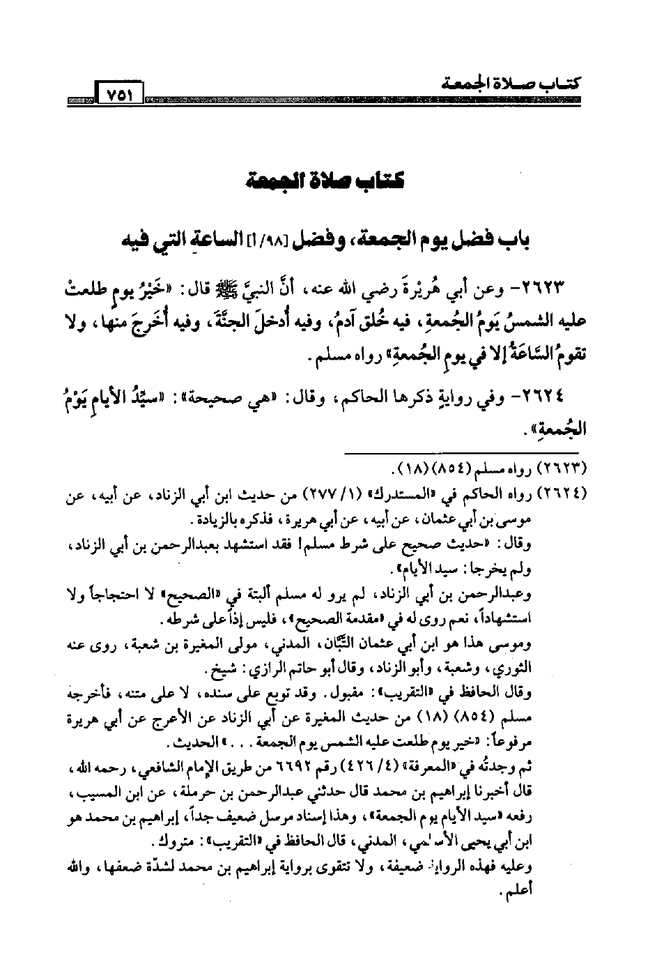 2623 - وَعَن أبي هُرَيْرَة رَضِيَ اللَّهُ عَنْه، أَن النَّبِي صَلَّى اللَّهُ عَلَيْهِ وَسَلَّم َ قَالَ: " خير يَوْم طلعت عَلَيْهِ الشَّمْس يَوْم الْجُمُعَة، فِيهِ خُلق آدم، وَفِيه أُدخل الْجنَّة، وَفِيه أُخرج مِنْهَا، وَلَا تقوم السَّاعَة إِلَّا فِي يَوْم الْجُمُعَة " رَوَاهُ مُسلم.