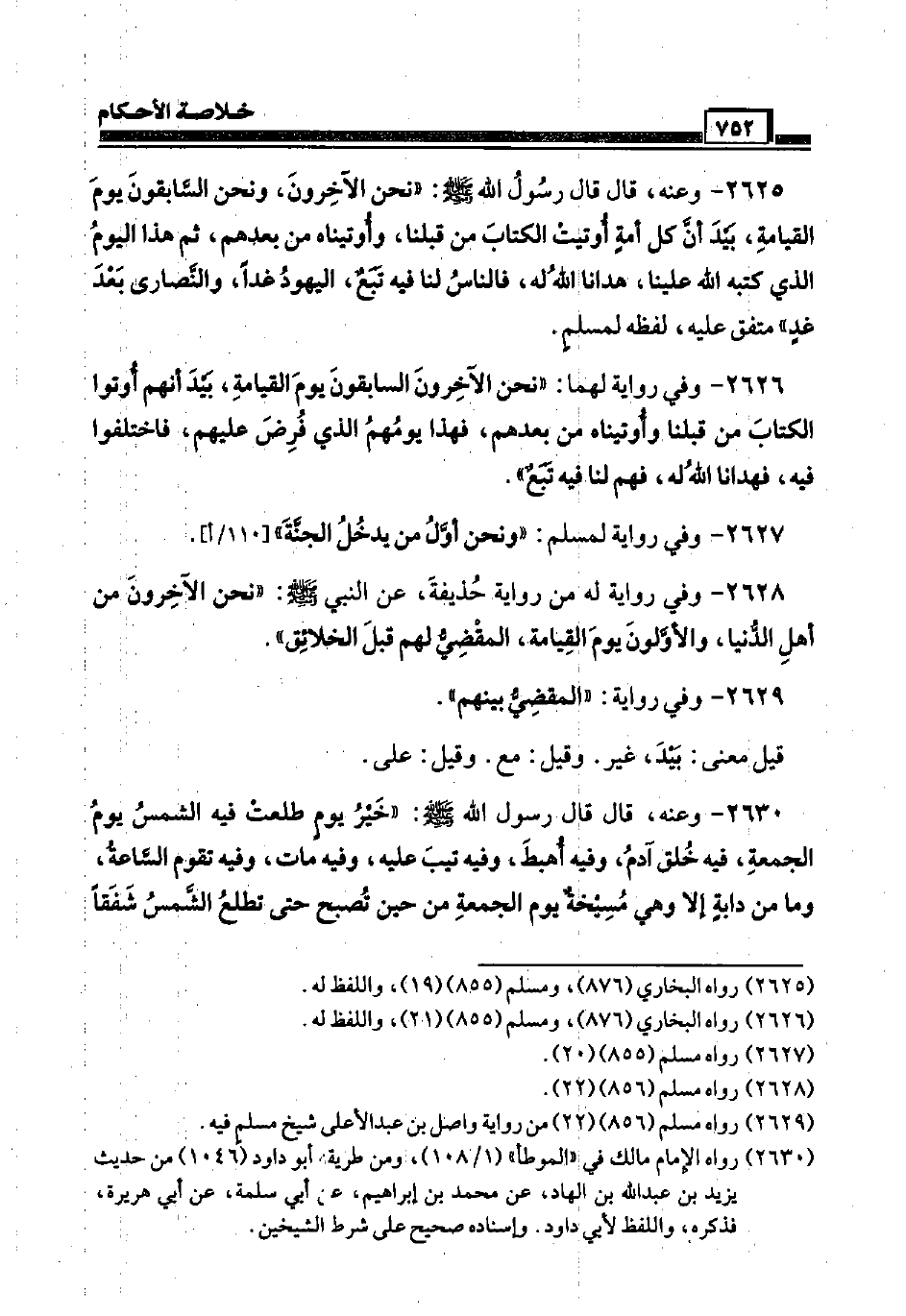 2625 - وَعنهُ، قَالَ قَالَ رَسُول الله صَلَّى اللَّهُ عَلَيْهِ وَسَلَّم َ: " نَحن الآخِرون، وَنحن السَّابِقُونَ يَوْم الْقِيَامَة، بيْد أَن كل أمة أُوتيت الْكتاب من قبلنَا، وأوتيناه من بعدهمْ، ثمَّ هَذَا الْيَوْم الَّذِي كتبه الله علينا، هدَانَا الله لَهُ، فَالنَّاس لنا فِيهِ تبع، الْيَهُود غَدا، وَالنَّصَارَى بعد غَد " مُتَّفق عَلَيْهِ، لَفظه لمُسلم.