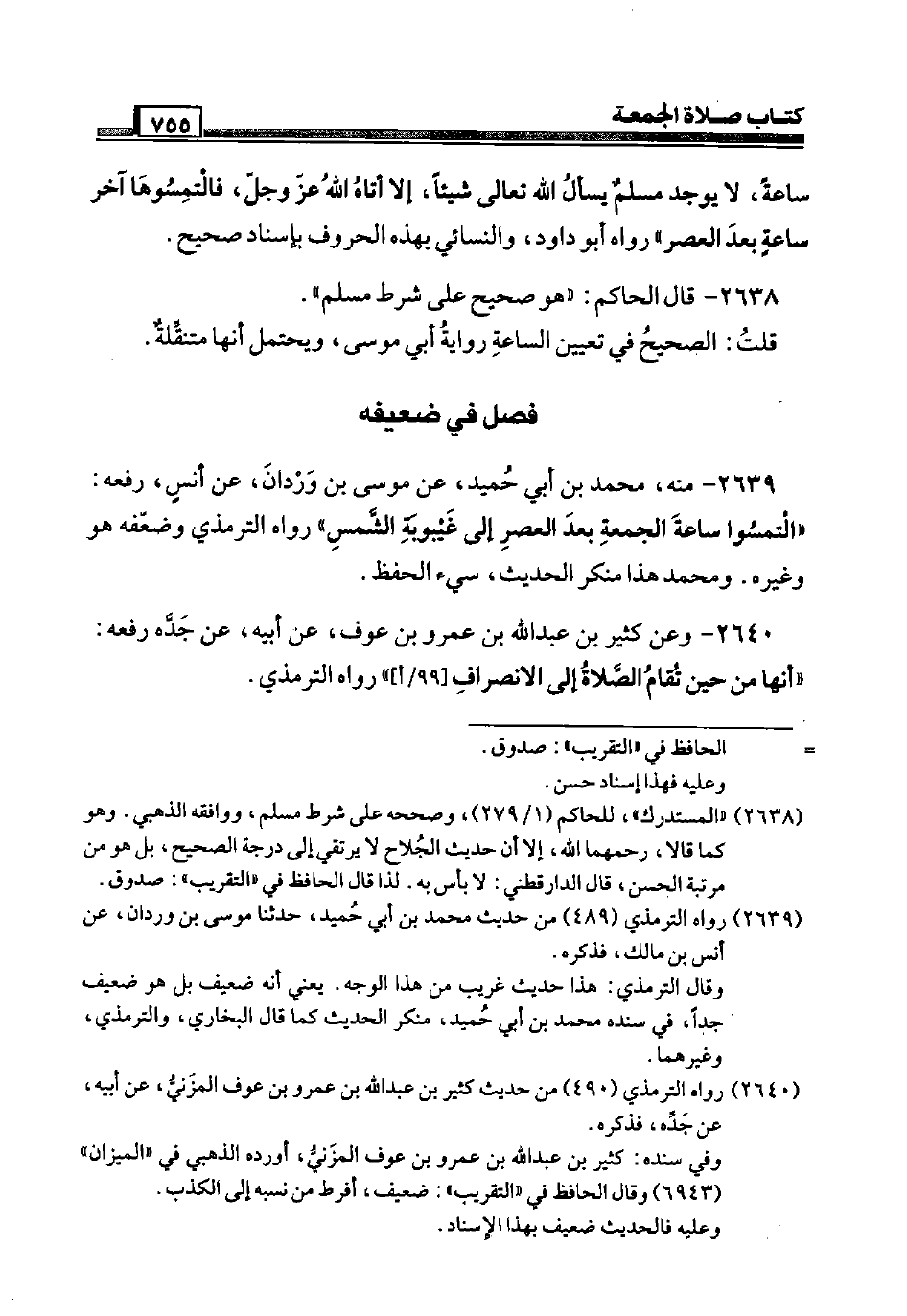 2638 - قَالَ الْحَاكِم: " هُوَ صَحِيح عَلَى شَرط مُسلم ". قلت: الصَّحِيح فِي تعْيين السَّاعَة رِوَايَة أبي مُوسَى، وَيحْتَمل أَنَّهَا متنقلة.