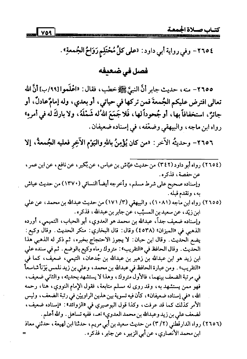 2655 - مِنْهُ، حَدِيث جَابر أَن النَّبِي صَلَّى اللَّهُ عَلَيْهِ وَسَلَّم َ خطب، فَقَالَ: " اعلموا [99 / ب] أَن الله تَعَالَى افْترض عَلَيْكُم الْجُمُعَة فَمن تَركهَا فِي حَياتِي، أَو بعدِي، وَله إِمَام عَادل، أَو جَائِر، اسْتِخْفَافًا بهَا، أَو جحُودًا لَهَا، فَلَا جمع الله لَهُ شَمله، وَلَا بَارك لَهُ فِي أمره " رَوَاهُ ابْن مَاجَه، وَالْبَيْهَقِيّ وضعّفه، فِي إِسْنَاده ضعيفان.