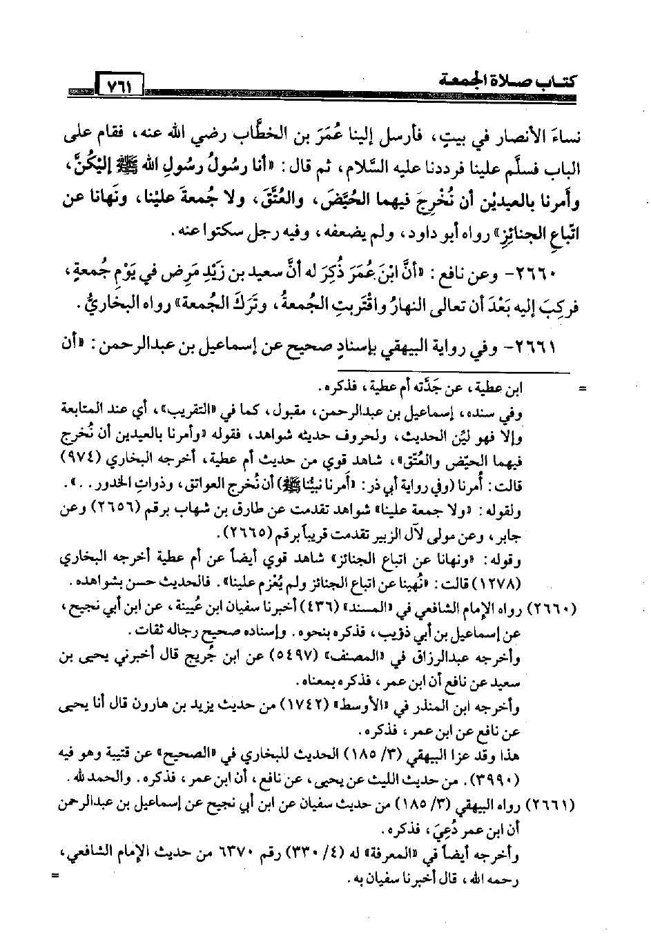 نسَاء الْأَنْصَار فِي بَيت، فَأرْسل إِلَيْنَا عمر بن الْخطاب رَضِيَ اللَّهُ عَنْه، فَقَامَ عَلَى الْبَاب فَسلم علينا فَرددْنَا عَلَيْهِ السَّلَام، ثمَّ قَالَ: " أَنا رَسُول رَسُول الله صَلَّى اللَّهُ عَلَيْهِ وَسَلَّم َ إلَيْكُنَّ، وأمرنا بالعيدين أَن نُخرج فيهمَا الحُيَّض، والعُتَّق، وَلَا جُمُعَة علينا، ونهانا عَن اتِّبَاع الْجَنَائِز " رَوَاهُ أَبُو دَاوُد، وَلم يُضعفهُ، وَفِيه رجل سكتوا عَنهُ.