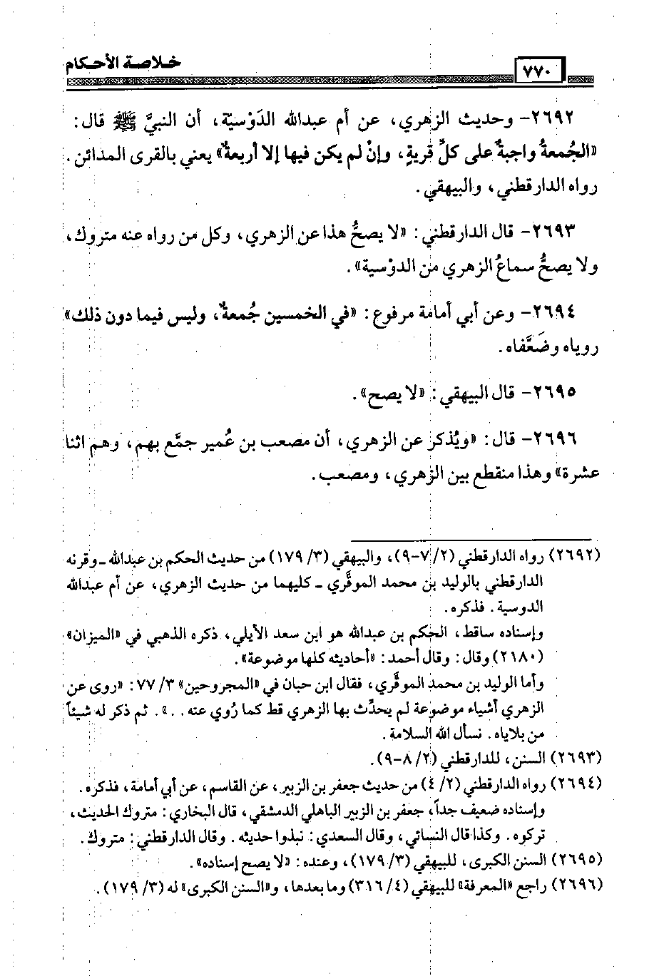 2692 - وَحَدِيث الزُّهْرِيّ، عَن أم عبد الله الدوسية، أَن النَّبِي صَلَّى اللَّهُ عَلَيْهِ وَسَلَّم َ قَالَ: " الْجُمُعَة وَاجِبَة عَلَى كل قَرْيَة، وَإِن لم يكن فِيهَا إِلَّا أَرْبَعَة " يَعْنِي بالقرى الْمَدَائِن. رَوَاهُ الدَّارَقُطْنِيّ، وَالْبَيْهَقِيّ.