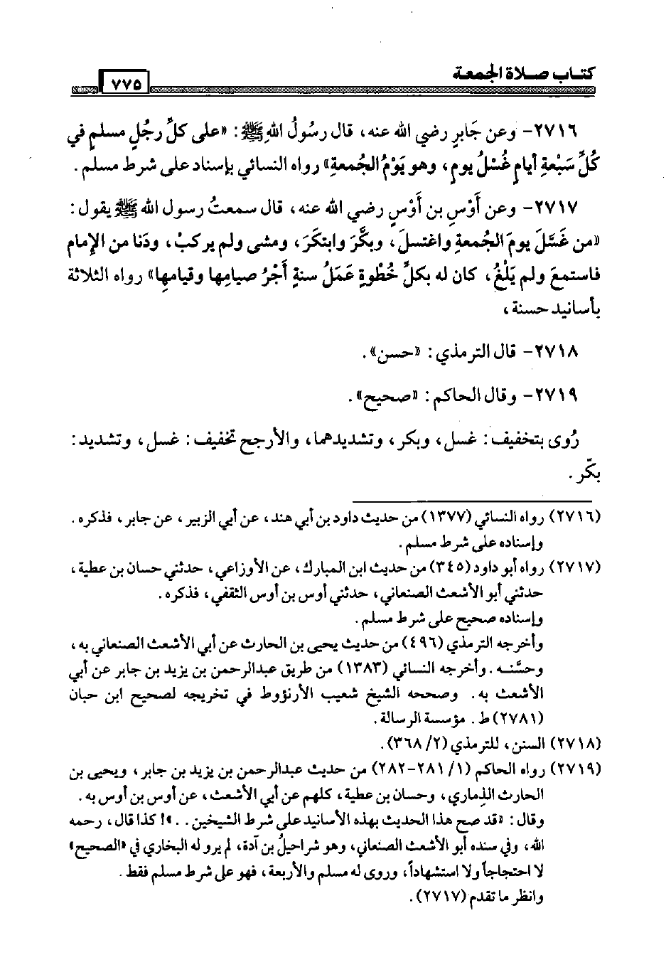 2719 - وَقَالَ الْحَاكِم: " صَحِيح ". رُوِيَ بتَخْفِيف: غسل، وَبكر، وتشديدهما، والأرجح تَخْفيف: غسل، وَتَشْديد: بكر.