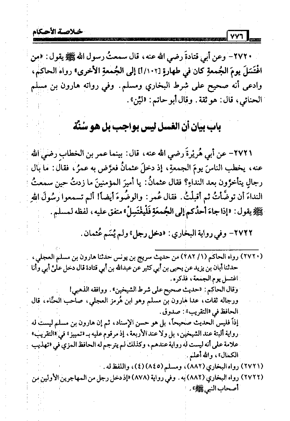 2721 - عَن أبي هُرَيْرَة رَضِيَ اللَّهُ عَنْه، قَالَ: بَيْنَمَا عمر بن الْخطاب رَضِيَ اللَّهُ عَنْه، يخْطب النَّاس يَوْم الْجُمُعَة، إِذْ دخل عُثْمَان فَعرض بِهِ عمر، فَقَالَ: مَا بَال رجال يتأخرون بعد النداء؟ فَقَالَ عُثْمَان: يَا أَمِير الْمُؤمنِينَ مَا زِدْت حِين سَمِعت النداء أَن تَوَضَّأت ثمَّ أَقبلت. فَقَالَ عمر: وَالْوُضُوء أَيْضا! ألم تسمعوا رَسُول الله صَلَّى اللَّهُ عَلَيْهِ وَسَلَّم َ يَقُول: " إِذا جَاءَ أحدكُم إِلَى الْجُمُعَة فليغتسل " مُتَّفق عَلَيْهِ، لَفظه لمُسلم.