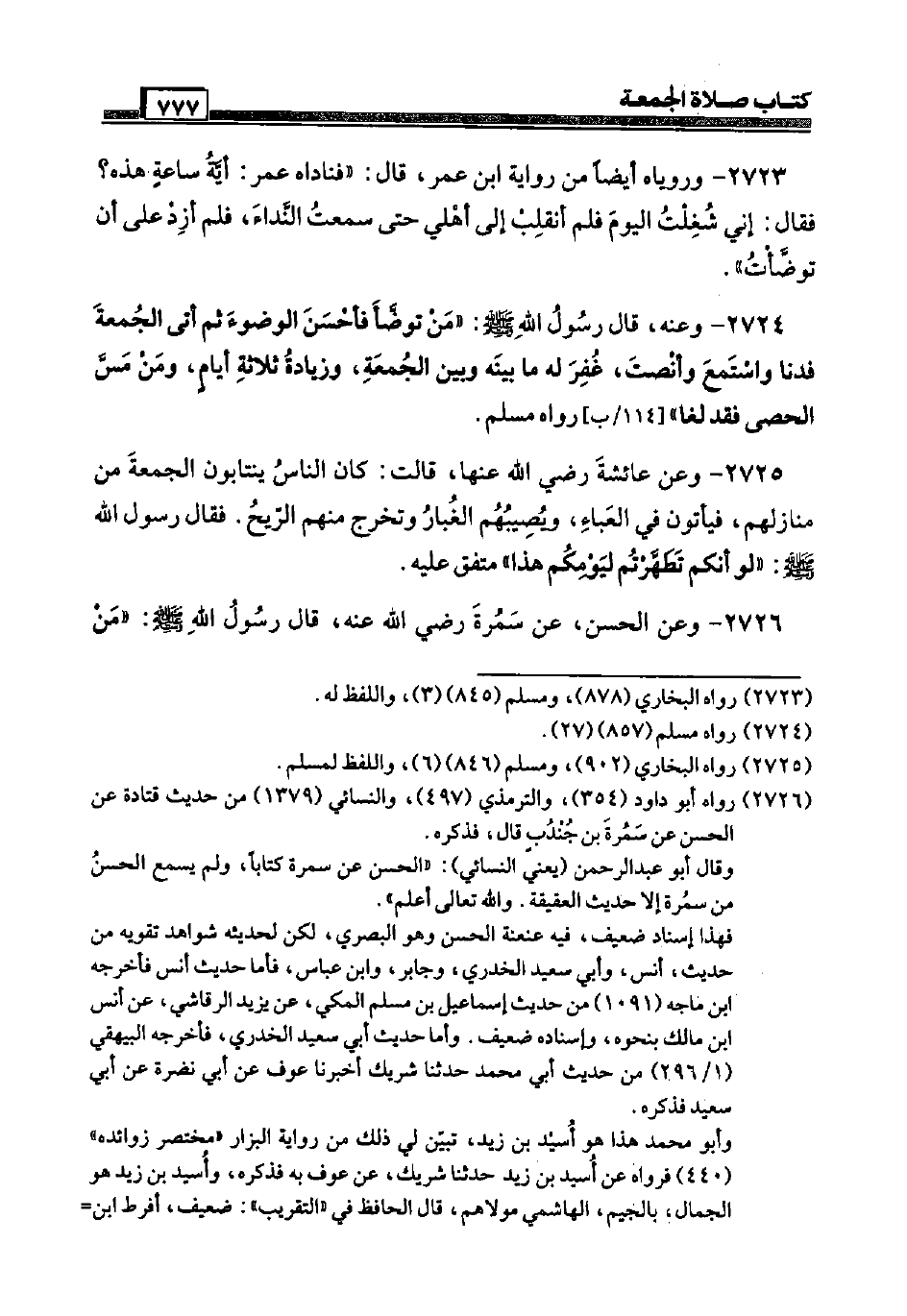 2725 - وَعَن عَائِشَة رَضِيَ اللَّهُ عَنْها، قَالَت: كَانَ النَّاس ينتابون الْجُمُعَة من مَنَازِلهمْ، فَيَأْتُونَ فِي العباء، ويصيبهم الْغُبَار وَتخرج مِنْهُم الرّيح. فَقَالَ رَسُول الله صَلَّى اللَّهُ عَلَيْهِ وَسَلَّم َ: " لَو أَنكُمْ تطهرتم ليومكم هَذَا " مُتَّفق عَلَيْهِ.