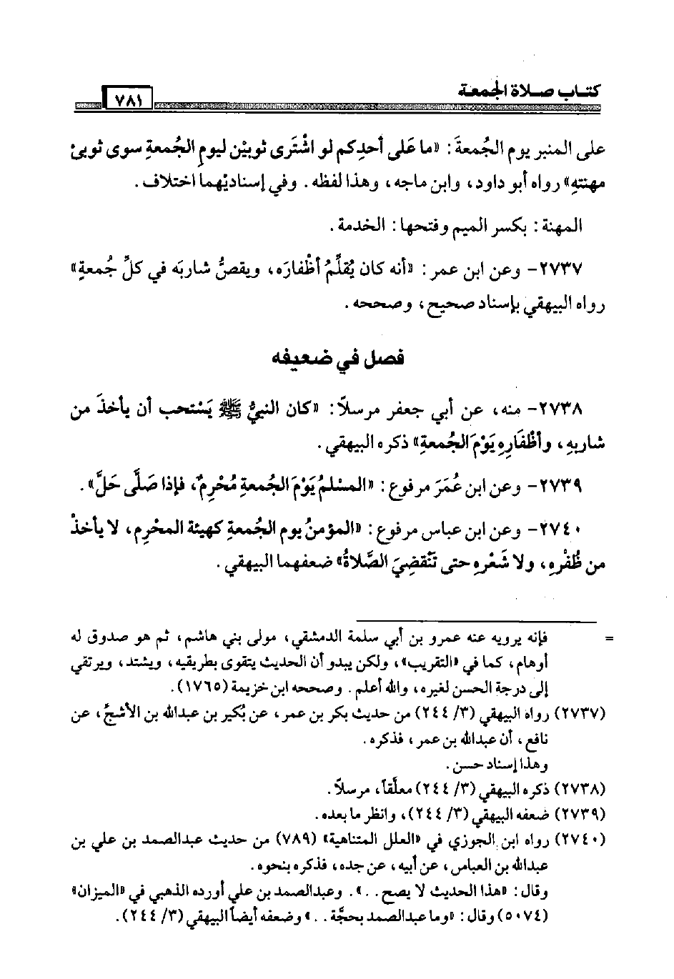 2737 - وَعَن ابْن عمر: " أَنه كَانَ يقلِّم أَظْفَاره، ويقص شَاربه فِي كل جُمُعَة " رَوَاهُ الْبَيْهَقِيّ بِإِسْنَاد صَحِيح، وَصَححهُ.