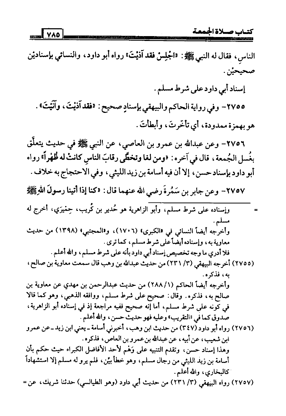 2756 - وَعَن عبد الله بن عَمْرو بن العَاصِي، عَن النَّبِي صَلَّى اللَّهُ عَلَيْهِ وَسَلَّم َ فِي حَدِيث يتَعَلَّق بغُسل الْجُمُعَة، قَالَ فِي آخِره: " وَمن لَغَا وتخطى رِقَاب النَّاس كَانَت لَهُ ظُهرا " رَوَاهُ أَبُو دَاوُد بِإِسْنَاد حسن، إِلَّا أَن فِيهِ أُسَامَة بن زيد اللَّيْثِيّ، وَفِي الِاحْتِجَاج بِهِ خلاف.