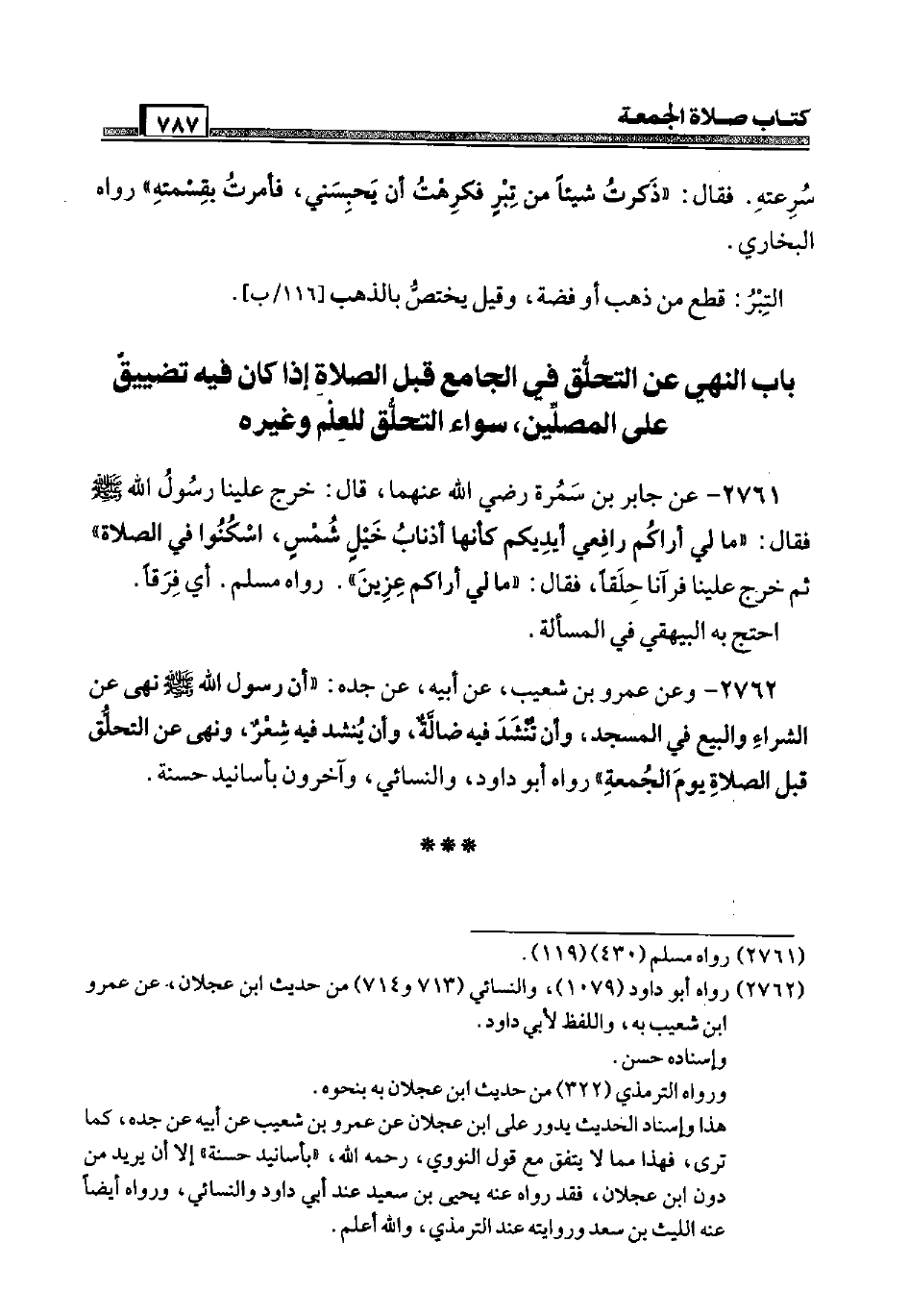 2762 - وَعَن عَمْرو بن شُعَيْب، عَن أَبِيه، عَن جده: " أَن رَسُول الله صَلَّى اللَّهُ عَلَيْهِ وَسَلَّم َ نهَى عَن الشِّرَاء وَالْبيع فِي الْمَسْجِد، وَأَن تُنشد فِيهِ ضالّة، وَأَن يُنشد فِيهِ شِعْر، وَنَهَى عَن التحلق قبل الصَّلَاة يَوْم الْجُمُعَة " رَوَاهُ أَبُو دَاوُد، وَالنَّسَائِيّ، وَآخَرُونَ بأسانيد حَسَنَة.