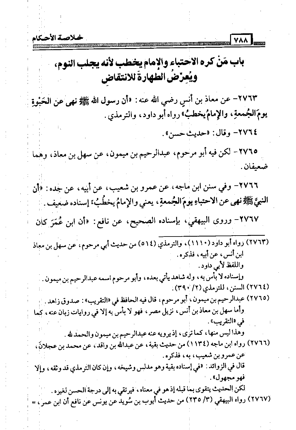 2763 - عَن معَاذ بن أنس رَضِيَ اللَّهُ عَنْه: " أَن رَسُول الله صَلَّى اللَّهُ عَلَيْهِ وَسَلَّم َ نهَى عَن الحبْوة يَوْم الْجُمُعَة، وَالْإِمَام يخْطب " رَوَاهُ أَبُو دَاوُد، وَالتِّرْمِذِيّ.