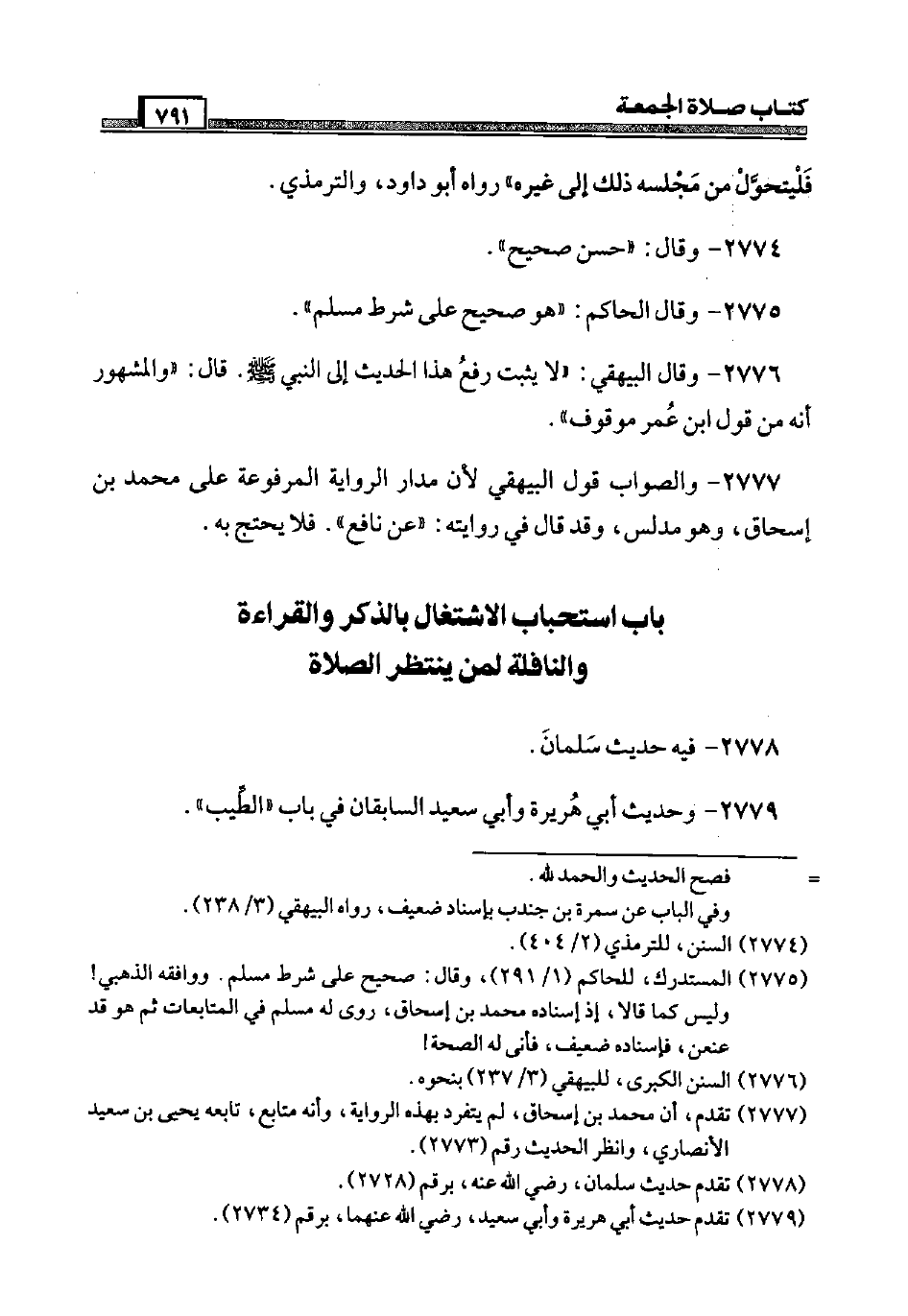 2777 - وَالصَّوَاب قَول الْبَيْهَقِيّ لِأَن مدَار الرِّوَايَة المرفوعة عَلَى مُحَمَّد بن إِسْحَاق، وَهُوَ مُدَلّس، وَقد قَالَ فِي رِوَايَته: " عَن نَافِع ". فَلَا يحْتَج بِهِ.