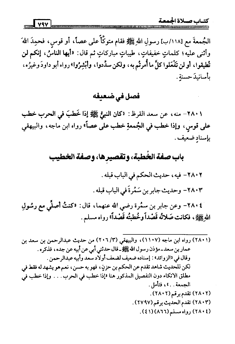 2801 - مِنْهُ، عَن سعد الْقرظ: " كَانَ النَّبِي صَلَّى اللَّهُ عَلَيْهِ وَسَلَّم َ إِذا خطب فِي الْحَرْب خطب عَلَى قَوس، وَإِذا خطب فِي الْجُمُعَة خطب عَلَى عَصا " رَوَاهُ ابْن ماجة، وَالْبَيْهَقِيّ بِإِسْنَاد ضَعِيف.