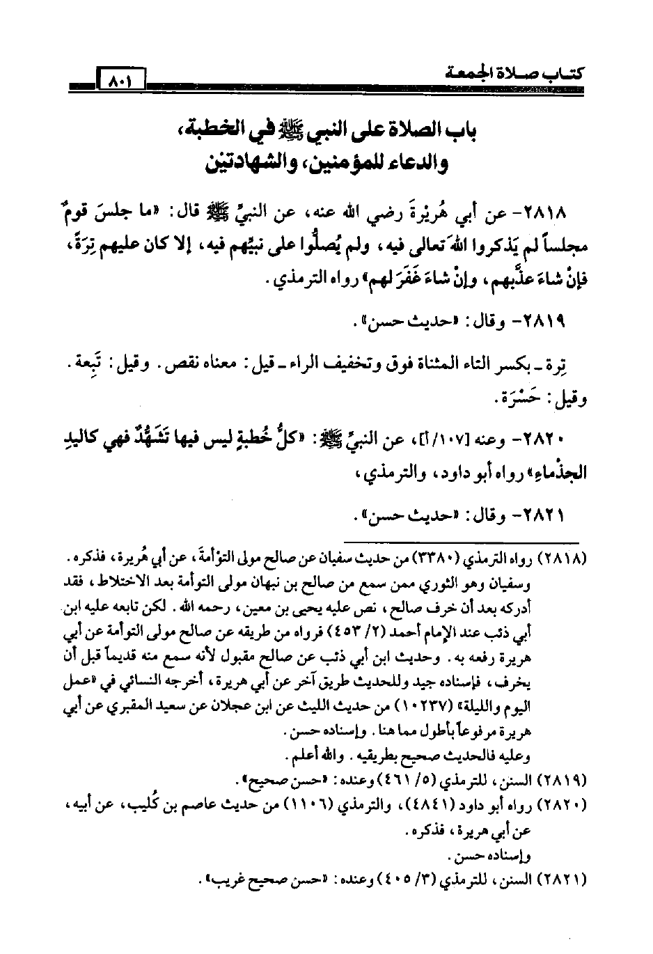2818 - عَن أبي هُرَيْرَة رَضِيَ اللَّهُ عَنْه، عَن النَّبِي صَلَّى اللَّهُ عَلَيْهِ وَسَلَّم َ قَالَ: " مَا جلس قوم مَجْلِسا لم يذكرُوا الله تَعَالَى فِيهِ، وَلم يصلوا عَلَى نَبِيّهم فِيهِ، إِلَّا كَانَ عَلَيْهِم ترة، فَإِن شَاءَ عذبهم، وَإِن شَاءَ غفر لَهُم " رَوَاهُ التِّرْمِذِيّ.