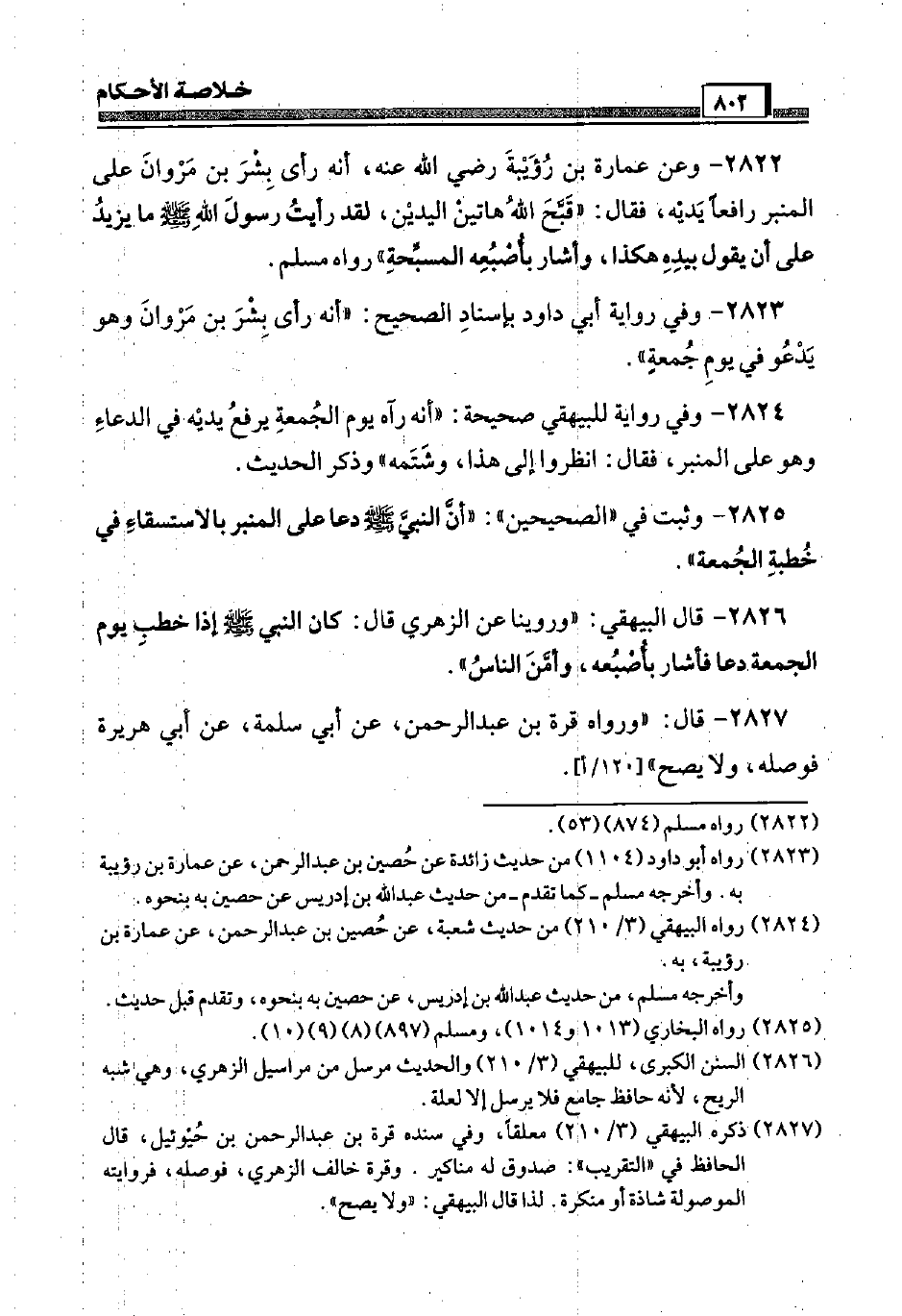 2822 - وَعَن عمَارَة بن رؤيبة رَضِيَ اللَّهُ عَنْه، أَنه رَأَى بشر بن مَرْوَان عَلَى الْمِنْبَر رَافعا يَدَيْهِ، فَقَالَ: " قبَّح الله هَاتين الْيَدَيْنِ، لقد رَأَيْت رَسُول الله صَلَّى اللَّهُ عَلَيْهِ وَسَلَّم َ مَا يزِيد عَلَى أَن يَقُول بِيَدِهِ هَكَذَا، وَأَشَارَ بِأُصْبُعِهِ المسبِّحة " رَوَاهُ مُسلم.