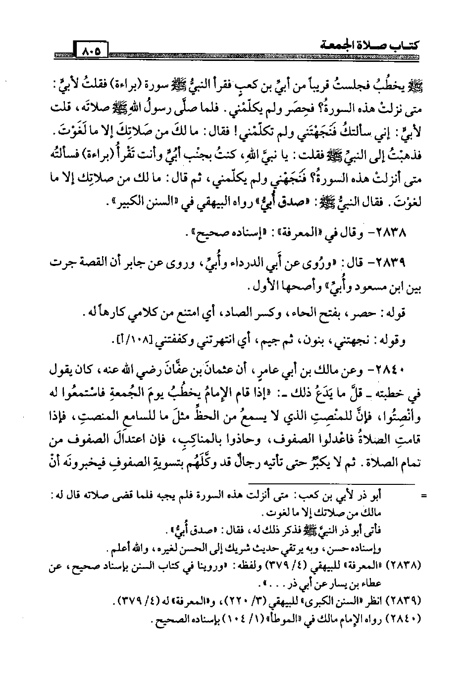 صَلَّى اللَّهُ عَلَيْهِ وَسَلَّم َ يخْطب فَجَلَست قَرِيبا من أبيّ بن كَعْب فَقَرَأَ النَّبِي صَلَّى اللَّهُ عَلَيْهِ وَسَلَّم َ سُورَة (بَرَاءَة) فَقلت لأبيّ: مَتى نزلت هَذِه السُّورَة؟ فحصر وَلم يكلمني. فَلَمَّا صَلَّى رَسُول الله صَلَّى اللَّهُ عَلَيْهِ وَسَلَّم َ صلَاته، قلت لأبيّ: إِنِّي سَأَلتك فنجهتني وَلم تكلمني! فَقَالَ: مَا لَك من صَلَاتك إِلَّا مَا لغوت. فَذَهَبت إِلَى النَّبِي صَلَّى اللَّهُ عَلَيْهِ وَسَلَّم َ فَقلت: يَا نَبِي الله، كنت بِجنب أُبيّ وَأَنت تقْرَأ (بَرَاءَة) فَسَأَلته مَتى أنزلت هَذِه السُّورَة؟ فنجهني وَلم يكلمني، ثمَّ قَالَ: مَا لَك من صَلَاتك إِلَّا مَا لغوت. فَقَالَ النَّبِي صَلَّى اللَّهُ عَلَيْهِ وَسَلَّم َ: " صدق أُبيّ " رَوَاهُ الْبَيْهَقِيّ فِي " السّنَن الْكَبِير ".