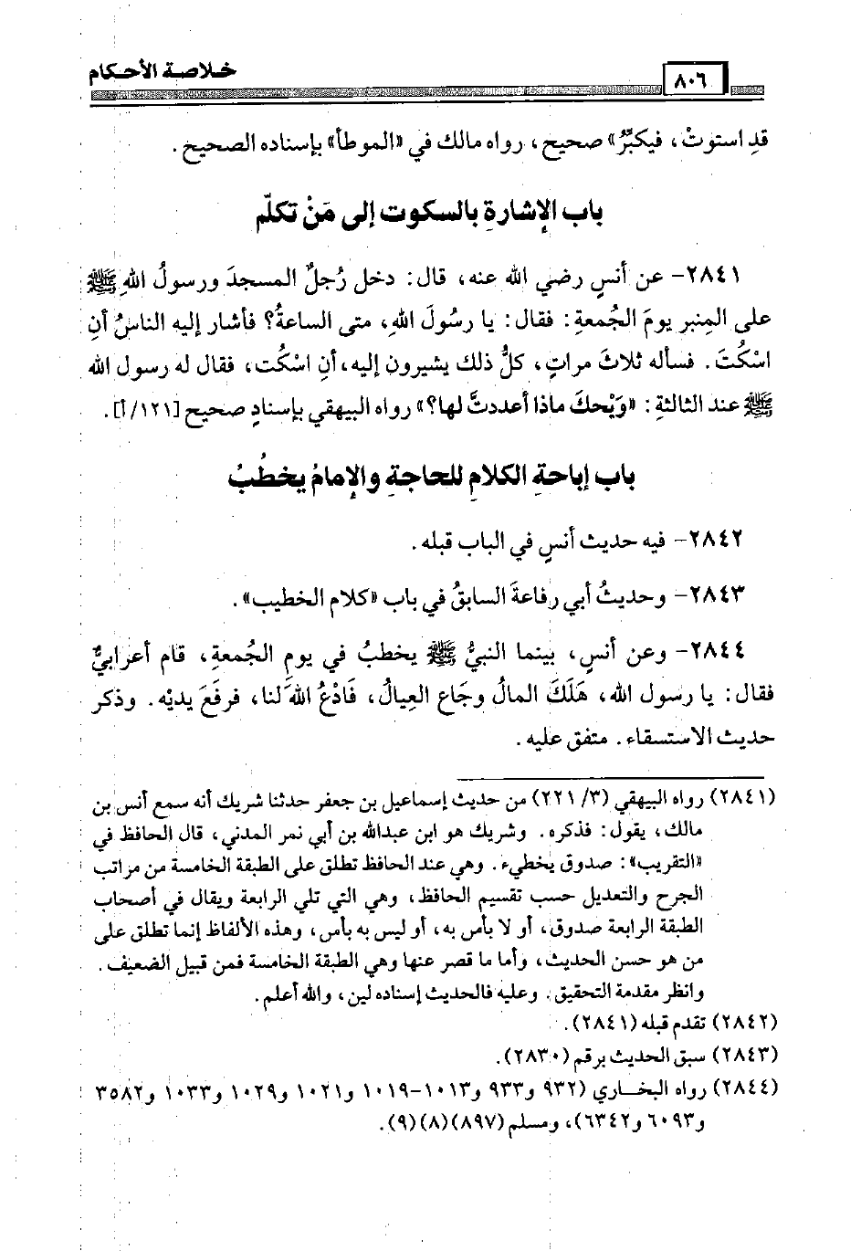 2841 - عَن أنس رَضِيَ اللَّهُ عَنْه، قَالَ: دخل رجل الْمَسْجِد وَرَسُول الله صَلَّى اللَّهُ عَلَيْهِ وَسَلَّم َ عَلَى الْمِنْبَر يَوْم الْجُمُعَة: فَقَالَ: يَا رَسُول الله، مَتى السَّاعَة؟ فَأَشَارَ إِلَيْهِ النَّاس أَن اسْكُتْ. فَسَأَلَهُ ثَلَاث مَرَّات، كل ذَلِك يشيرون إِلَيْهِ، أَن اسْكُتْ، فَقَالَ لَهُ رَسُول الله صَلَّى اللَّهُ عَلَيْهِ وَسَلَّم َ عِنْد الثَّالِثَة: " وَيحك مَاذَا أَعدَدْت لَهَا؟ " رَوَاهُ الْبَيْهَقِيّ بِإِسْنَاد صَحِيح [121 / أ] .