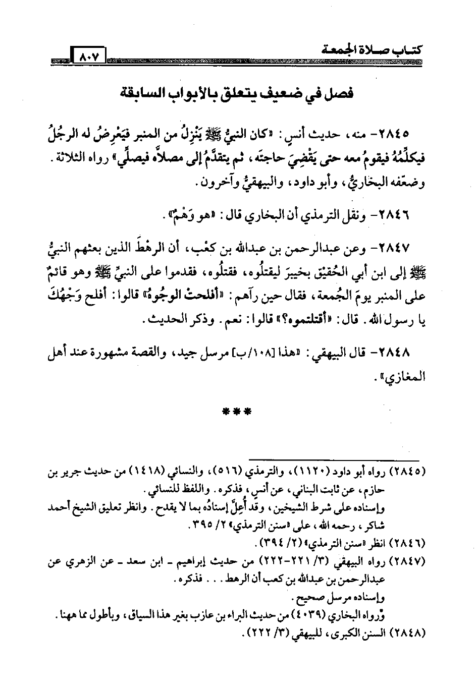 2845 - مِنْهُ، حَدِيث أنس: " كَانَ النَّبِي صَلَّى اللَّهُ عَلَيْهِ وَسَلَّم َ ينزل من الْمِنْبَر فَيعرض لَهُ الرجل فيكلمه فَيقوم مَعَه حَتَّى يقْضِي حَاجته، ثمَّ يتَقَدَّم إِلَى مُصَلَّاهُ فَيصَلي " رَوَاهُ الثَّلَاثَة. وَضَعفه البُخَارِيّ، وَأَبُو دَاوُد، وَالْبَيْهَقِيّ وَآخَرُونَ.