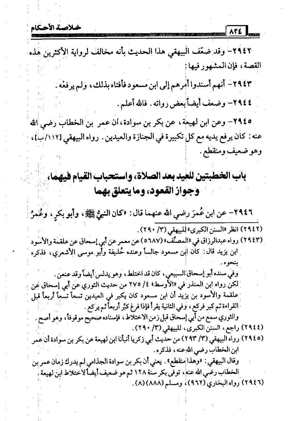 2945 - وَعَن ابْن لَهِيعَة، عَن بكر بن سوَادَة، أَن عمر بن الْخطاب رَضِيَ اللَّهُ عَنْه: كَانَ يرفع يَدَيْهِ مَعَ كل تَكْبِيرَة فِي الْجِنَازَة وَالْعِيدَيْنِ. رَوَاهُ الْبَيْهَقِيّ [112 / ب] ، وَهُوَ ضَعِيف ومنقطع.