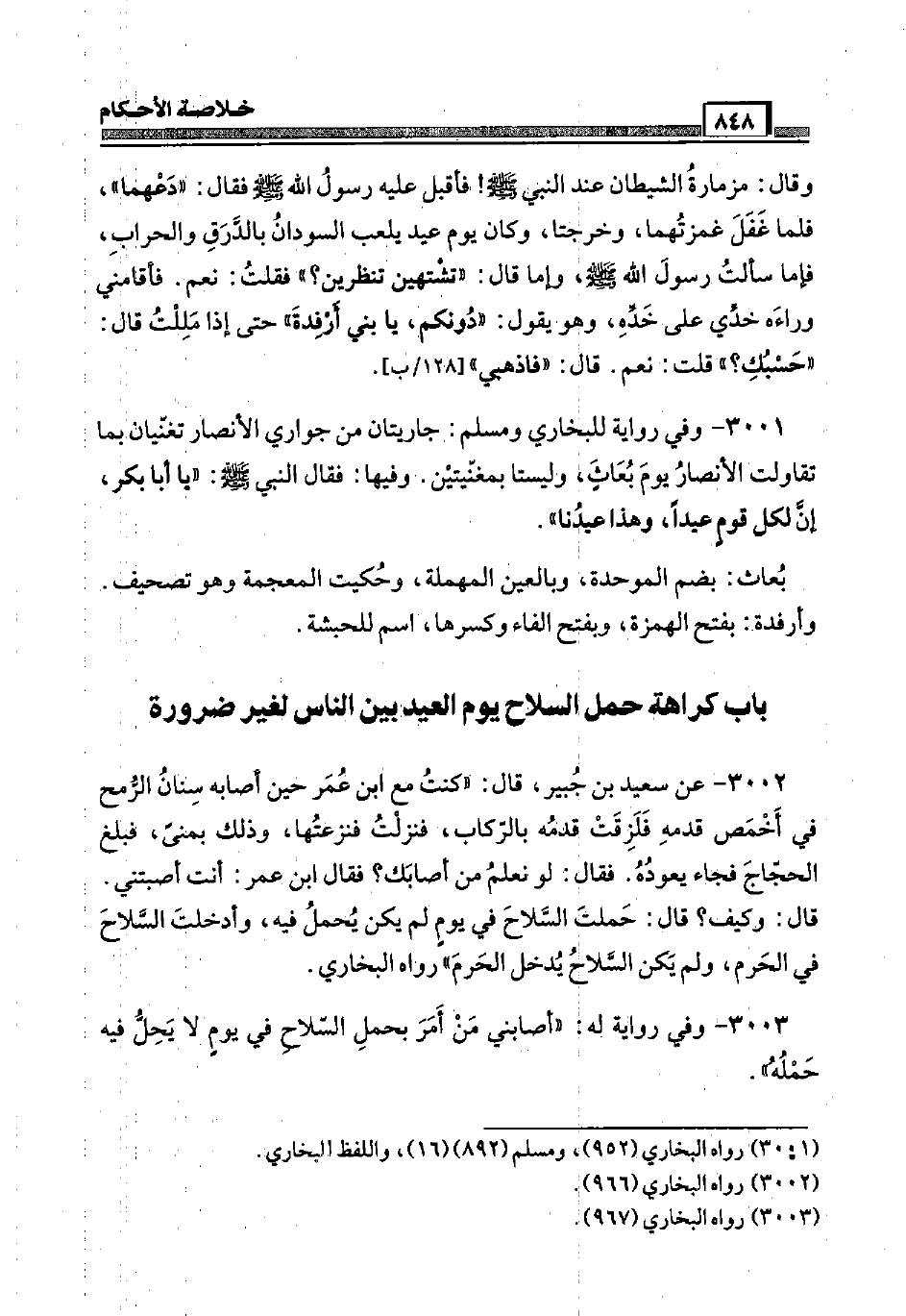 3001 - وَفِي رِوَايَة للْبُخَارِيّ وَمُسلم: جاريتان من جواري الْأَنْصَار تغنّيان بِمَا تقاولت الْأَنْصَار يَوْم بُعَاث، وليستا بمغنيتين. وفيهَا: فَقَالَ النَّبِي صَلَّى اللَّهُ عَلَيْهِ وَسَلَّم َ: " يَا أَبَا بكر، إِن لكل قوم عيداً، وَهَذَا عيدنا ". بُعاث: بِضَم الْمُوَحدَة، وبالعين الْمُهْملَة، وحُكيت الْمُعْجَمَة وَهُوَ تَصْحِيف. وأرفدة: بِفَتْح الْهمزَة، وبفتح الْفَاء وَكسرهَا، اسْم للحبشة.