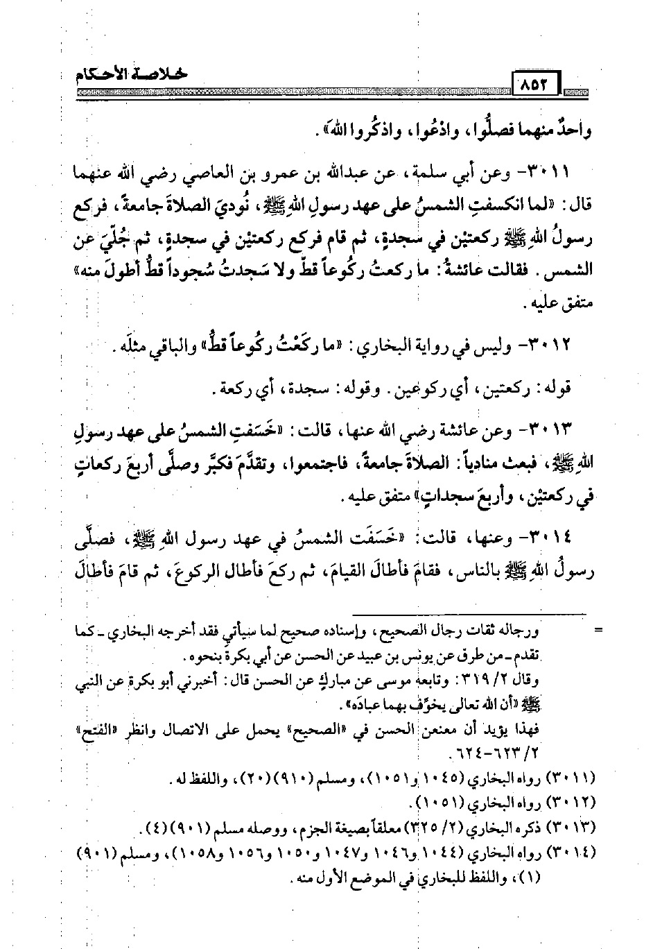 3011 - وَعَن أبي سَلمَة، عَن عبد الله بن عَمْرو بن العَاصِي رَضِيَ اللَّهُ عَنْهما قَالَ: " لما انكسفت الشَّمْس عَلَى عهد رَسُول الله صَلَّى اللَّهُ عَلَيْهِ وَسَلَّم َ، نُودي الصَّلَاة جَامِعَة، فَرَكَعَ رَسُول الله صَلَّى اللَّهُ عَلَيْهِ وَسَلَّم َ رَكْعَتَيْنِ فِي سَجْدَة، ثمَّ قَامَ فَرَكَعَ رَكْعَتَيْنِ فِي سَجْدَة، ثمَّ جلي عَن الشَّمْس. فَقَالَت عَائِشَة: مَا ركعت رُكُوعًا قطّ وَلَا سجدت سجودا قطّ أطول مِنْهُ " مُتَّفق عَلَيْهِ.