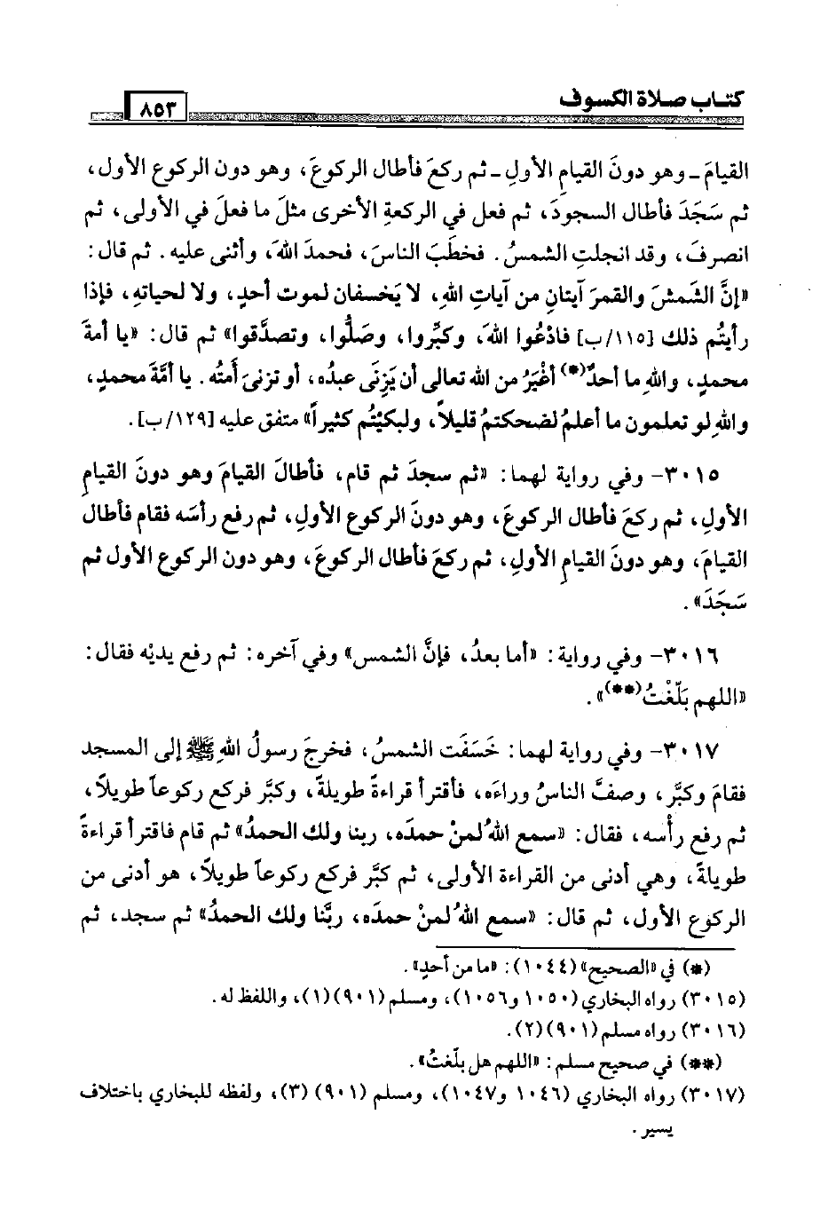 3017 - وَفِي رِوَايَة لَهما: خسفت الشَّمْس، فَخرج رَسُول الله صَلَّى اللَّهُ عَلَيْهِ وَسَلَّم َ إِلَى الْمَسْجِد فَقَامَ وَكبر، وصف النَّاس وَرَاءه، فأقترأ قِرَاءَة طَوِيلَة، وَكبر فَرَكَعَ رُكُوعًا طَويلا، ثمَّ رفع رَأسه، فَقَالَ: " سمع الله لمن حَمده، رَبنَا وَلَك الْحَمد " ثمَّ قَامَ فاقترأ قِرَاءَة طَوِيلَة، وَهِي أدنَى من الْقِرَاءَة الأولَى، ثمَّ كبر فَرَكَعَ رُكُوعًا طَويلا، هُوَ أدنَى من الرُّكُوع الأول، ثمَّ قَالَ: " سمع الله لمن حَمده، رَبنَا وَلَك الْحَمد " ثمَّ سجد، ثمَّ