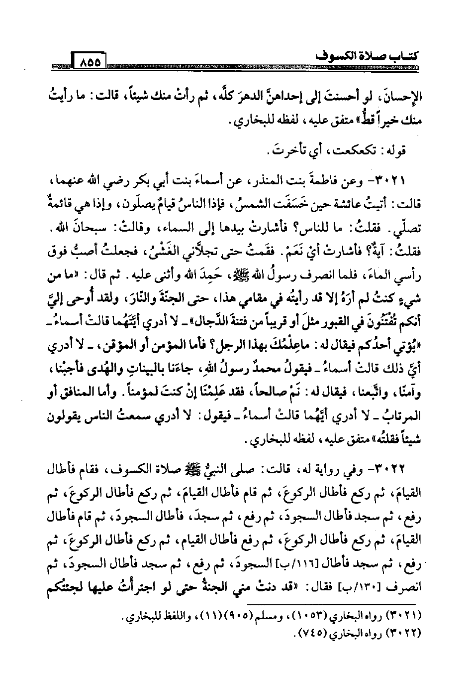 3022 - وَفِي رِوَايَة لَهُ، قَالَت: صَلَّى النَّبِي صَلَّى اللَّهُ عَلَيْهِ وَسَلَّم َ صَلَاة الْكُسُوف، فَقَامَ فَأطَال الْقيام، ثمَّ ركع فَأطَال الرُّكُوع، ثمَّ قَالَ فَأطَال الْقيام، ثمَّ ركع فَأطَال الرُّكُوع، ثمَّ رفع، ثمَّ سجد فَأطَال السُّجُود، ثمَّ رفع، ثمَّ سجد، فَأطَال السُّجُود، ثمَّ قَامَ فَأطَال الْقيام، ثمَّ ركع فَأطَال الرُّكُوع، ثمَّ رفع فَأطَال الْقيام، ثمَّ ركع فَأطَال الرُّكُوع، ثمَّ رفع، ثمَّ سجد فَأطَال [116 / ب] السُّجُود، ثمَّ رفع، ثمَّ سجد فَأطَال السُّجُود، ثمَّ انْصَرف [130 / ب] فَقَالَ: " قد دنت مني الْجنَّة حَتَّى لَو اجترأت عَلَيْهَا لجئتكم