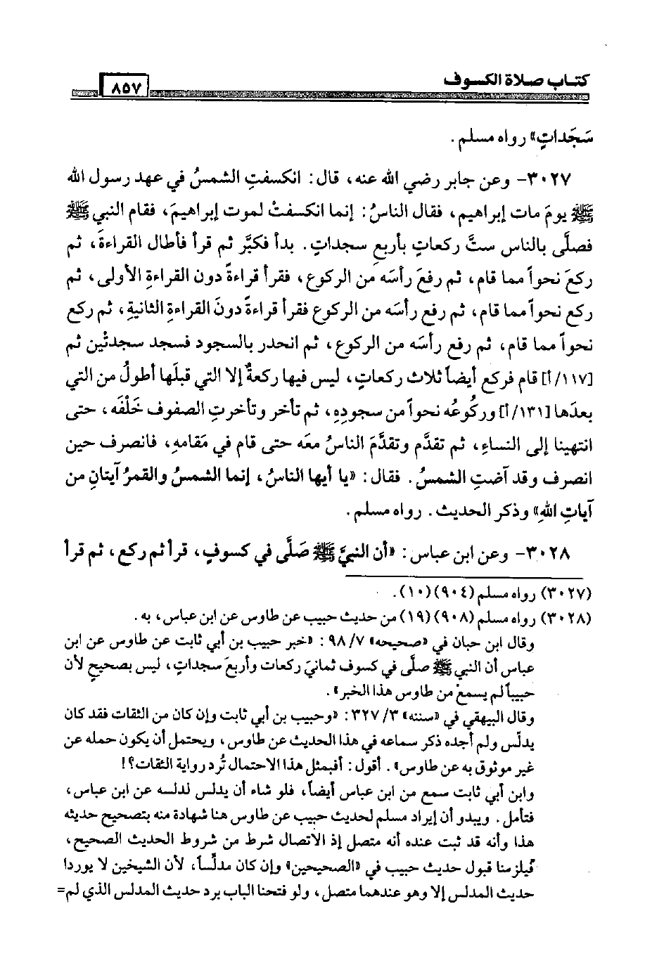 3027 - وَعَن جَابر رَضِيَ اللَّهُ عَنْه، قَالَ: انكسفت الشَّمْس فِي عهد رَسُول الله صَلَّى اللَّهُ عَلَيْهِ وَسَلَّم َ يَوْم مَاتَ إِبْرَاهِيم، فَقَالَ النَّاس: إِنَّمَا انكسفت لمَوْت إِبْرَاهِيم، فَقَامَ النَّبِي صَلَّى اللَّهُ عَلَيْهِ وَسَلَّم َ فَصَلى بِالنَّاسِ سِتّ رَكْعَات بِأَرْبَع سَجدَات. بَدَأَ فَكبر ثمَّ قَرَأَ فَأطَال الْقِرَاءَة، ثمَّ ركع نَحوا مِمَّا قَامَ، ثمَّ رفع رَأسه من الرُّكُوع، فَقَرَأَ قِرَاءَة دون الْقِرَاءَة الأولَى، ثمَّ ركع نَحوا مِمَّا قَامَ، ثمَّ رفع رَأسه من الرُّكُوع فَقَرَأَ قِرَاءَة دون الْقِرَاءَة الثَّانِيَة، ثمَّ ركع نَحوا مِمَّا قَامَ، ثمَّ رفع رَأسه من الرُّكُوع، ثمَّ انحدر بِالسُّجُود فَسجدَ سَجْدَتَيْنِ ثمَّ [117 / أ] قَامَ فَرَكَعَ أَيْضا ثَلَاث رَكْعَات، لَيْسَ فِيهَا رَكْعَة إِلَّا الَّتِي قبلهَا أطول من الَّتِي بعْدهَا [131 / أ] وركوعه نَحوا من سُجُوده، ثمَّ تَأَخّر وتأخرت الصُّفُوف خَلفه، حَتَّى انتهينا إِلَى النِّسَاء، ثمَّ تقدم وَتقدم النَّاس مَعَه حَتَّى قَامَ فِي مقَامه، فَانْصَرف حِين انْصَرف وَقد آضت الشَّمْس. فَقَالَ: " يَا أَيهَا النَّاس، إِنَّمَا الشَّمْس وَالْقَمَر آيتان من آيَات الله " وَذكر الحَدِيث. رَوَاهُ مُسلم.