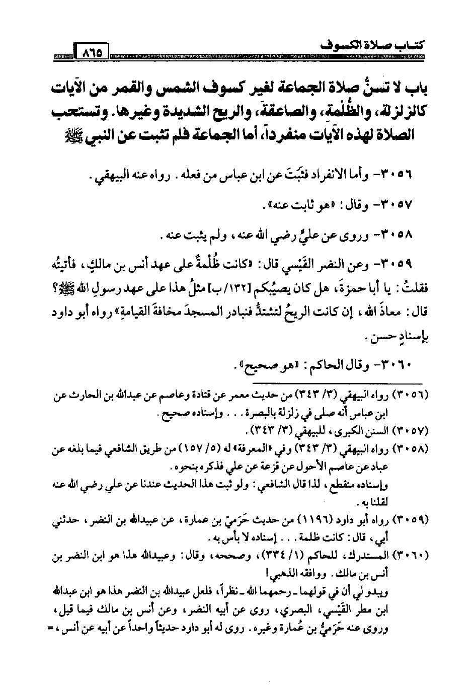 (بَاب لَا تسن صَلَاة الْجَمَاعَة لغير كسوف الشَّمْس وَالْقَمَر من الْآيَات كالزلزلة، والظلمة، والصاعقة، وَالرِّيح الشَّدِيدَة وَغَيرهَا. وتستحب الصَّلَاة لهَذِهِ الْآيَات مُنْفَردا، أما الْجَمَاعَة فَلم تثبت عَن النَّبِي صَلَّى اللَّهُ عَلَيْهِ وَسَلَّم َ)