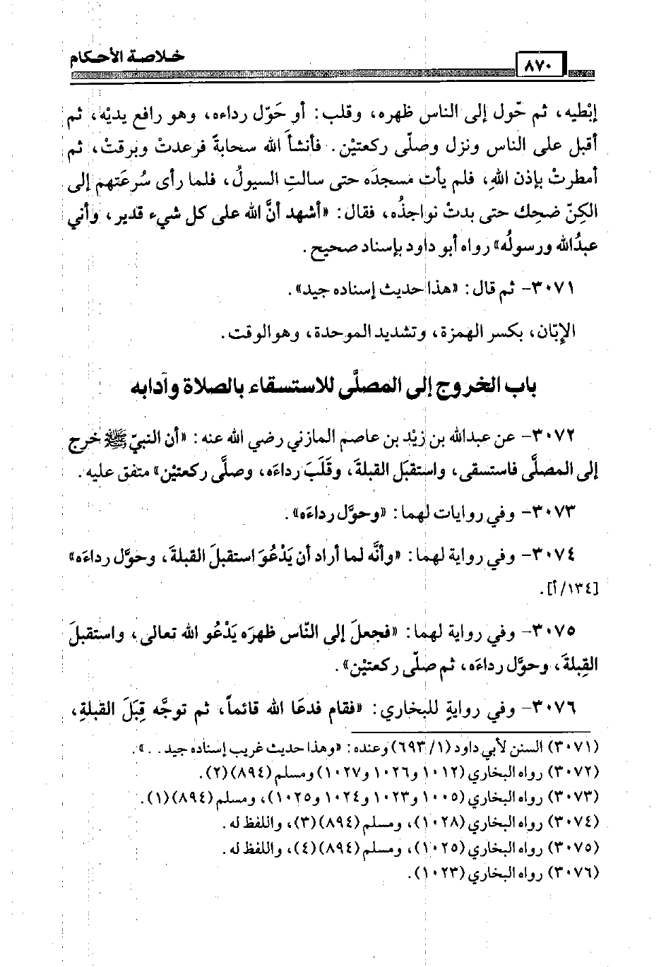 3072 - عَن عبد الله بن زيد بن عَاصِم الْمَازِني رَضِيَ اللَّهُ عَنْه: " أَن النَّبِي صَلَّى اللَّهُ عَلَيْهِ وَسَلَّم َ خرج إِلَى الْمُصَلى فَاسْتَسْقَى، واستقبل الْقبْلَة، وقلب رِدَاءَهُ، وَصَلى رَكْعَتَيْنِ " مُتَّفق عَلَيْهِ.
