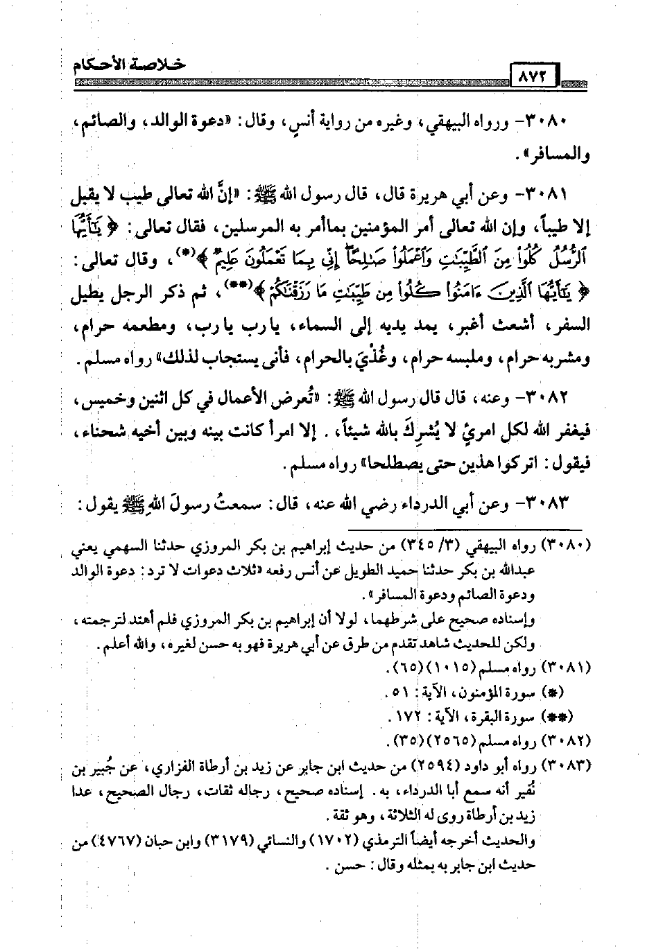 3081 - وَعَن أبي هُرَيْرَة قَالَ، قَالَ رَسُول الله صَلَّى اللَّهُ عَلَيْهِ وَسَلَّم َ: " إِن الله تَعَالَى طيب لَا يقبل إِلَّا طيبا، وَإِن الله تَعَالَى أَمر الْمُؤمنِينَ بِمَا أَمر بِهِ الْمُرْسلين، فَقَالَ تَعَالَى: {يَا أَيهَا الرُّسُل كلوا من الطَّيِّبَات وَاعْمَلُوا صَالحا إِنِّي بِمَا تَعْمَلُونَ عليم} ، وَقَالَ تَعَالَى: {يَا أَيهَا الَّذين آمنُوا كلوا من طَيّبَات مَا رزقناكم} ، ثمَّ ذكر الرجل يُطِيل السّفر، أَشْعَث أغبر، يمد يَدَيْهِ إِلَى السَّمَاء، يَا رب يَا رب، ومطعمه حرَام، ومشربه حرَام، وملبسه حرَام، وغذي بالحرام، فَأَنَّى يُسْتَجَاب لذَلِك " رَوَاهُ مُسلم.