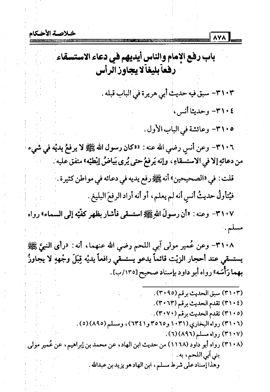 3108 - وَعَن عُمَيْر مولَى آبي اللَّحْم رَضِيَ اللَّهُ عَنْهما، أَنه: " رَأَى النَّبِي صَلَّى اللَّهُ عَلَيْهِ وَسَلَّم َ يَسْتَسْقِي عِنْد أَحْجَار الزَّيْت قَائِما يَدْعُو يَسْتَسْقِي رَافعا يَدَيْهِ قِبَل وَجهه لَا يُجَاوز بهما رَأسه " رَوَاهُ أَبُو دَاوُد بِإِسْنَاد صَحِيح [135 / ب] .
