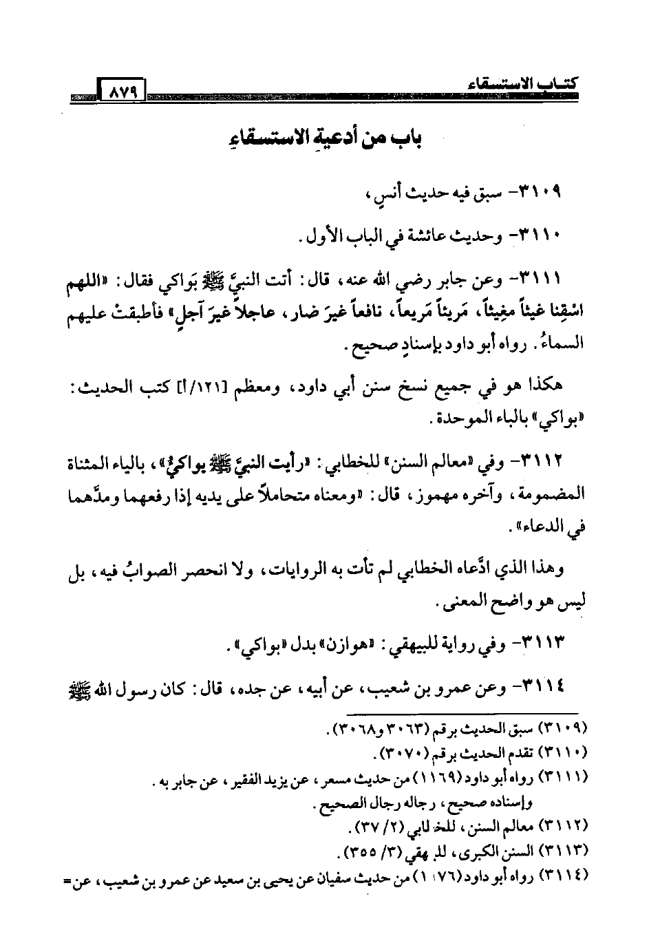 3111 - وَعَن جَابر رَضِيَ اللَّهُ عَنْه، قَالَ: أَتَت النَّبِي صَلَّى اللَّهُ عَلَيْهِ وَسَلَّم َ بواكي فَقَالَ: " اللَّهُمَّ اسقنا غيثاً مغيثاً، مريئاً مريعاً، نَافِعًا غير ضار، عَاجلا غير آجل " فأطبقت عَلَيْهِم السَّمَاء. رَوَاهُ أَبُو دَاوُد بِإِسْنَاد صَحِيح. هَكَذَا هُوَ فِي جَمِيع نسخ سنَن أبي دَاوُد، ومعظم [121 / أ] كتب الحَدِيث: " بواكي " بِالْبَاء الْمُوَحدَة.