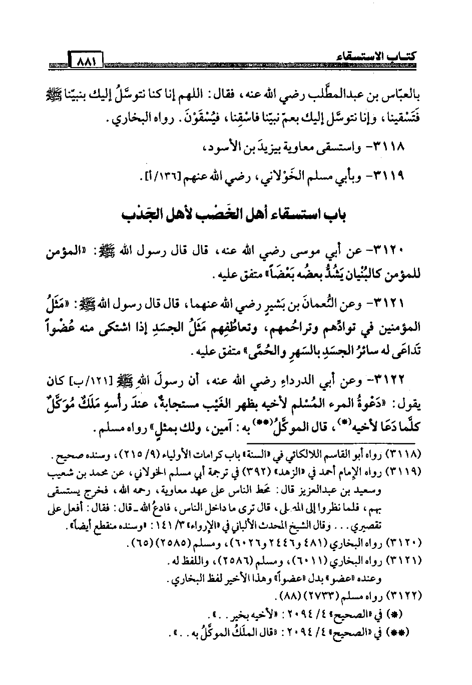 3120 - عَن أبي مُوسَى رَضِيَ اللَّهُ عَنْه، قَالَ قَالَ رَسُول الله صَلَّى اللَّهُ عَلَيْهِ وَسَلَّم َ: " الْمُؤمن لِلْمُؤمنِ كالبنيان يشد بعضه بَعْضًا " مُتَّفق عَلَيْهِ.