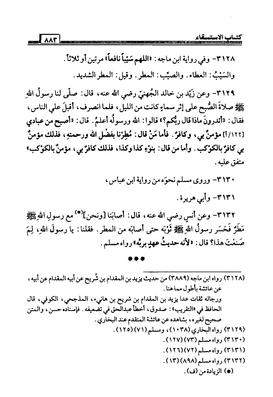 3129 - وَعَن زيد بن خَالِد الْجُهَنِيّ رَضِيَ اللَّهُ عَنْه، قَالَ: صَلَّى لنا رَسُول الله صَلَّى اللَّهُ عَلَيْهِ وَسَلَّم َ صَلَاة الصُّبْح عَلَى إِثْر سَمَاء كَانَت من اللَّيْل، فَلَمَّا انْصَرف، أقبل عَلّي النَّاس، فَقَالَ: " أَتَدْرُونَ مَاذَا قَالَ ربكُم؟ " قَالُوا: الله وَرَسُوله أعلم. قَالَ: " أصبح من عبَادي [122 / أ] مُؤمن بِي، وَكَافِر. فَأَما من قَالَ: مُطرنا بِفضل الله وَرَحمته، فَذَلِك مُؤمن بِي كَافِر بالكوكب. وَأما من قَالَ: بِنَوْء كَذَا وَكَذَا، فَذَلِك كَافِر بِي، مُؤمن بالكوكب " مُتَّفق عَلَيْهِ.
