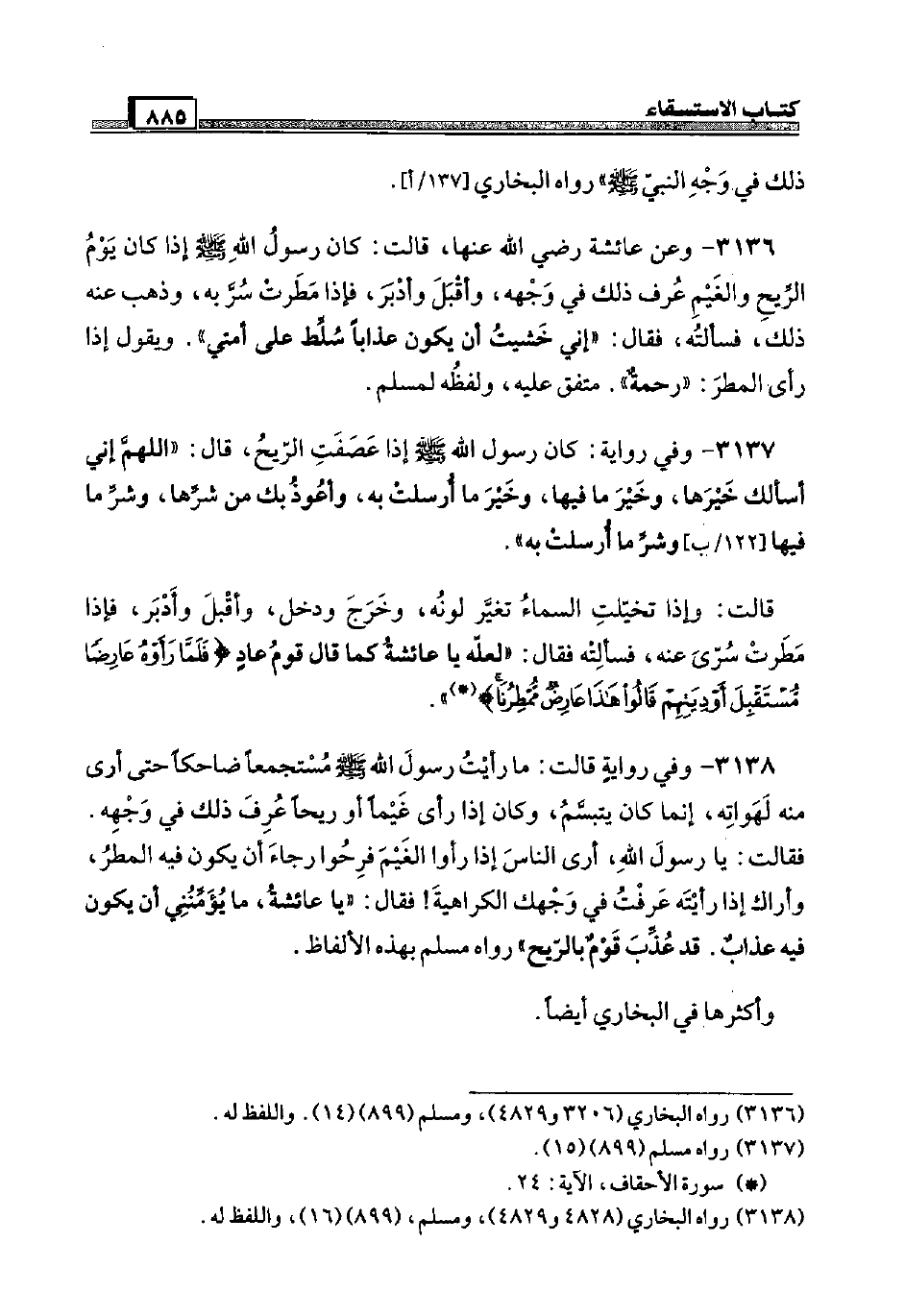3137 - وَفِي رِوَايَة: كَانَ رَسُول الله صَلَّى اللَّهُ عَلَيْهِ وَسَلَّم َ إِذا عصفت الرّيح، قَالَ: " اللَّهُمَّ إِنِّي أَسأَلك خَيرهَا، وَخير مَا فِيهَا، وَخير مَا أُرسلت بِهِ، وَأَعُوذ بك من شَرها، وَشر مَا فِيهَا [122 / ب] وَشر مَا أرْسلت بِهِ ". قَالَت: وَإِذا تَخَيَّلت السَّمَاء تغيّر لَونه، وَخرج وَدخل، وَأَقْبل وَأدبر، فَإِذا مطرَت سُرّى عَنهُ، فَسَأَلته فَقَالَ: " لَعَلَّه يَا عَائِشَة كَمَا قَالَ قوم عَاد {فَلَمَّا رَأَوْهُ عارضا مُسْتَقْبل أَوْدِيَتهمْ قَالُوا هَذَا عَارض مُمْطِرنَا} ".