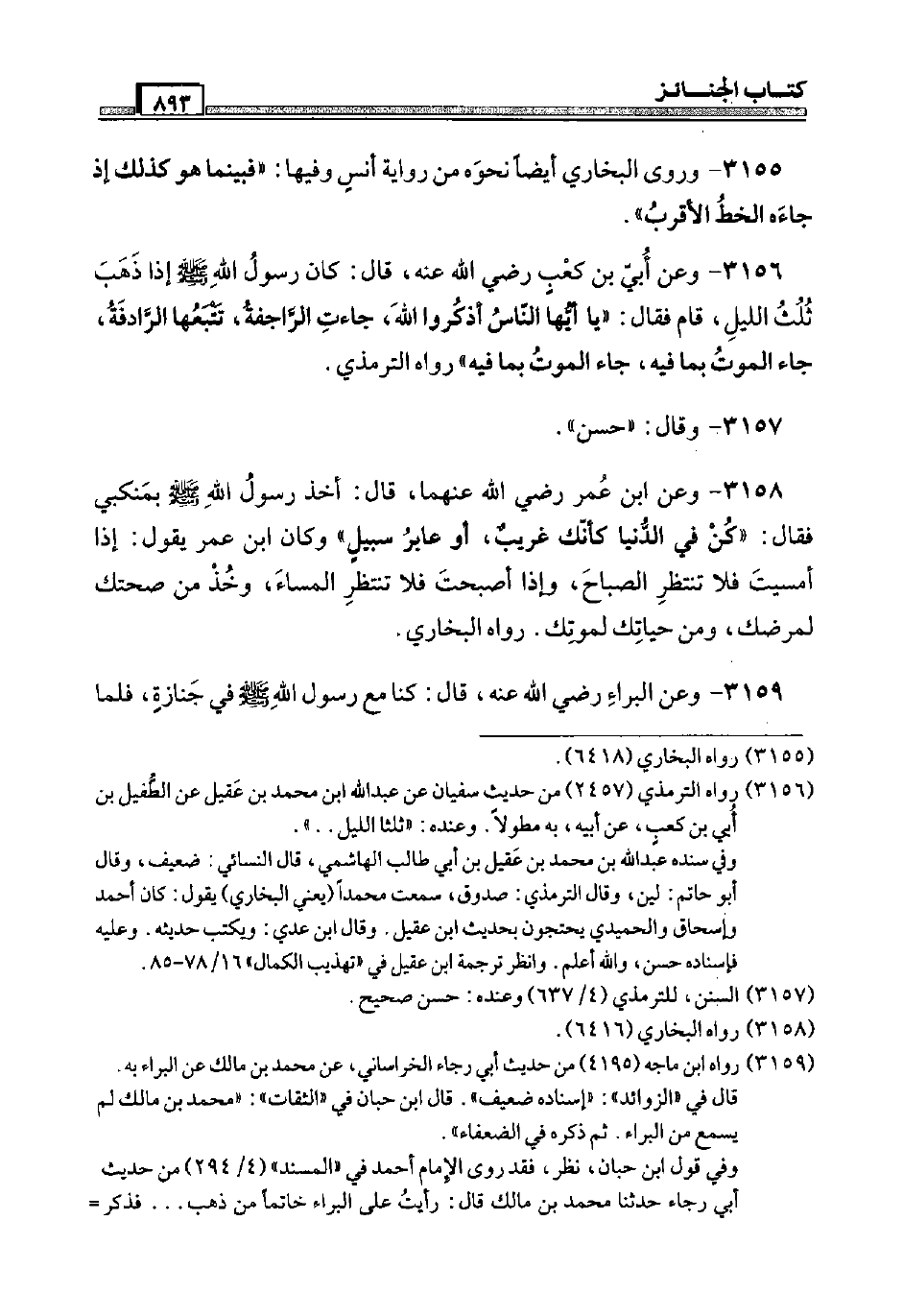 3158 - وَعَن ابْن عمر رَضِيَ اللَّهُ عَنْهما، قَالَ: أَخذ رَسُول الله صَلَّى اللَّهُ عَلَيْهِ وَسَلَّم َ بمنكبي فَقَالَ: " كن فِي الدُّنْيَا كَأَنَّك غَرِيب، أَو عَابِر سَبِيل " وَكَانَ ابْن عمر يَقُول: إِذا أمسيت فَلَا تنْتَظر الصَّباح، وَإِذا أَصبَحت فَلَا تنْتَظر الْمسَاء، وَخذ من صحتك لمرضك، وَمن حياتك لموتك. رَوَاهُ البُخَارِيّ.