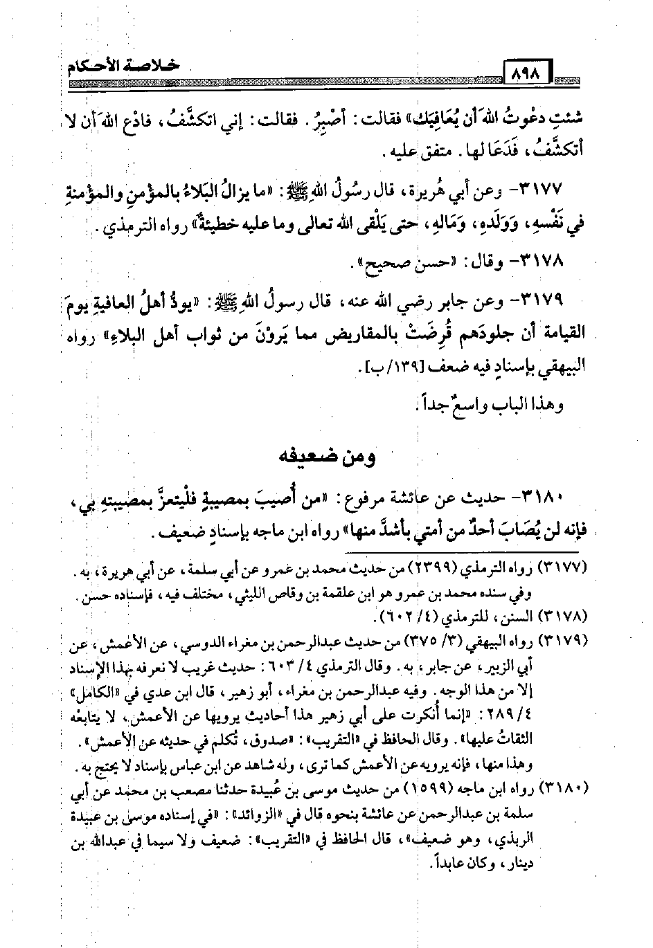 3180 - حَدِيث عَن عَائِشَة مَرْفُوع: " من أُصِيب بمصيبة فليتعز بمصيبته بِي، فَإِنَّهُ لن يصاب أحد من أمتِي بأشد مِنْهَا " رَوَاهُ ابْن ماجة بِإِسْنَاد ضَعِيف.