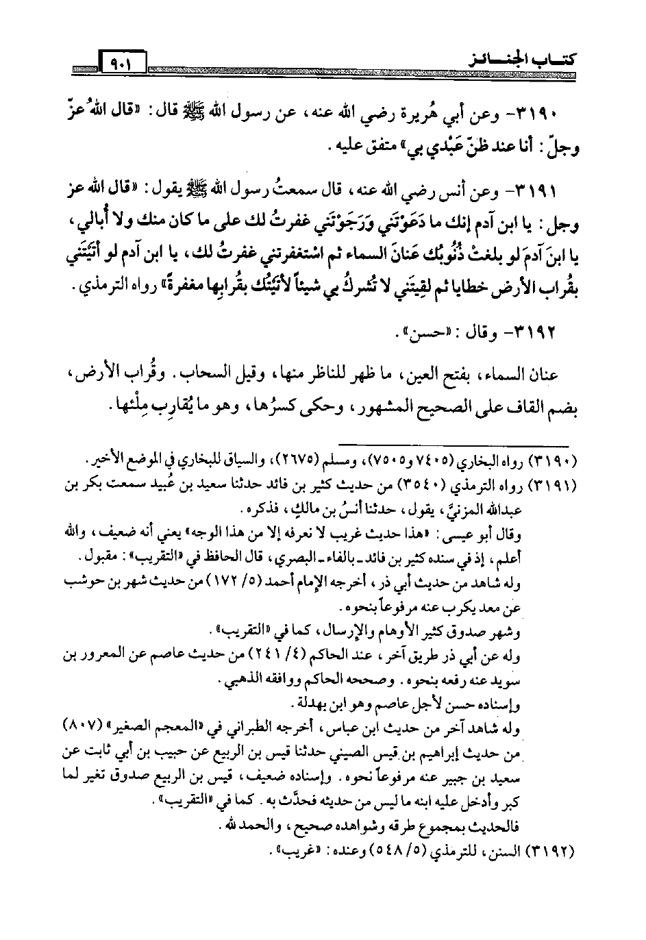 3191 - وَعَن أنس رَضِيَ اللَّهُ عَنْه، قَالَ سَمِعت رَسُول الله صَلَّى اللَّهُ عَلَيْهِ وَسَلَّم َ يَقُول: " قَالَ الله عَزَّ وَجَلَّ: يَا ابْن آدم إِنَّك مَا دعوتني ورجوتني غفرت لَك عَلَى مَا كَانَ مِنْك وَلَا أُبَالِي، يَا ابْن آدم لَو بلغت ذنوبك عنان السَّمَاء ثمَّ استغفرتني غفرت لَك، يَا ابْن آدم لَو أتيتني بقراب الأَرْض خَطَايَا ثمَّ لقيتني لَا تشرك بِي شَيْئا لأتيتك بقرابها مغْفرَة " رَوَاهُ التِّرْمِذِيّ.