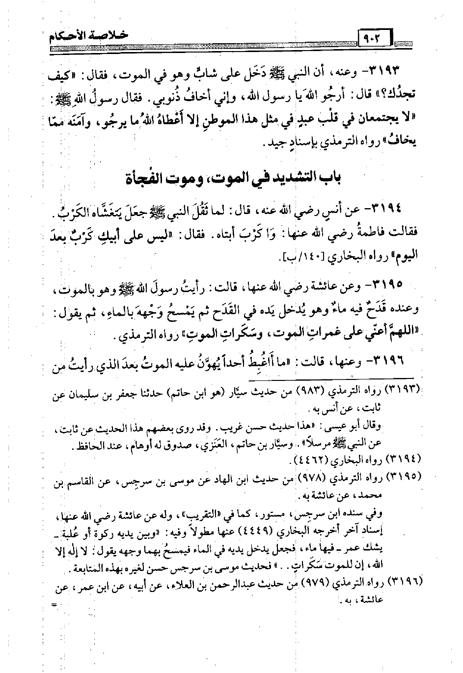 3195 - وَعَن عَائِشَة رَضِيَ اللَّهُ عَنْها، قَالَت: رَأَيْت رَسُول الله صَلَّى اللَّهُ عَلَيْهِ وَسَلَّم َ وَهُوَ بِالْمَوْتِ، وَعِنْده قدح فِيهِ مَاء وَهُوَ يدْخل يَده فِي الْقدح ثمَّ يمسح وَجهه بِالْمَاءِ، ثمَّ يَقُول: " اللَّهُمَّ أَعنِي عَلَى غَمَرَات الْمَوْت، وسكرات الْمَوْت " رَوَاهُ التِّرْمِذِيّ.