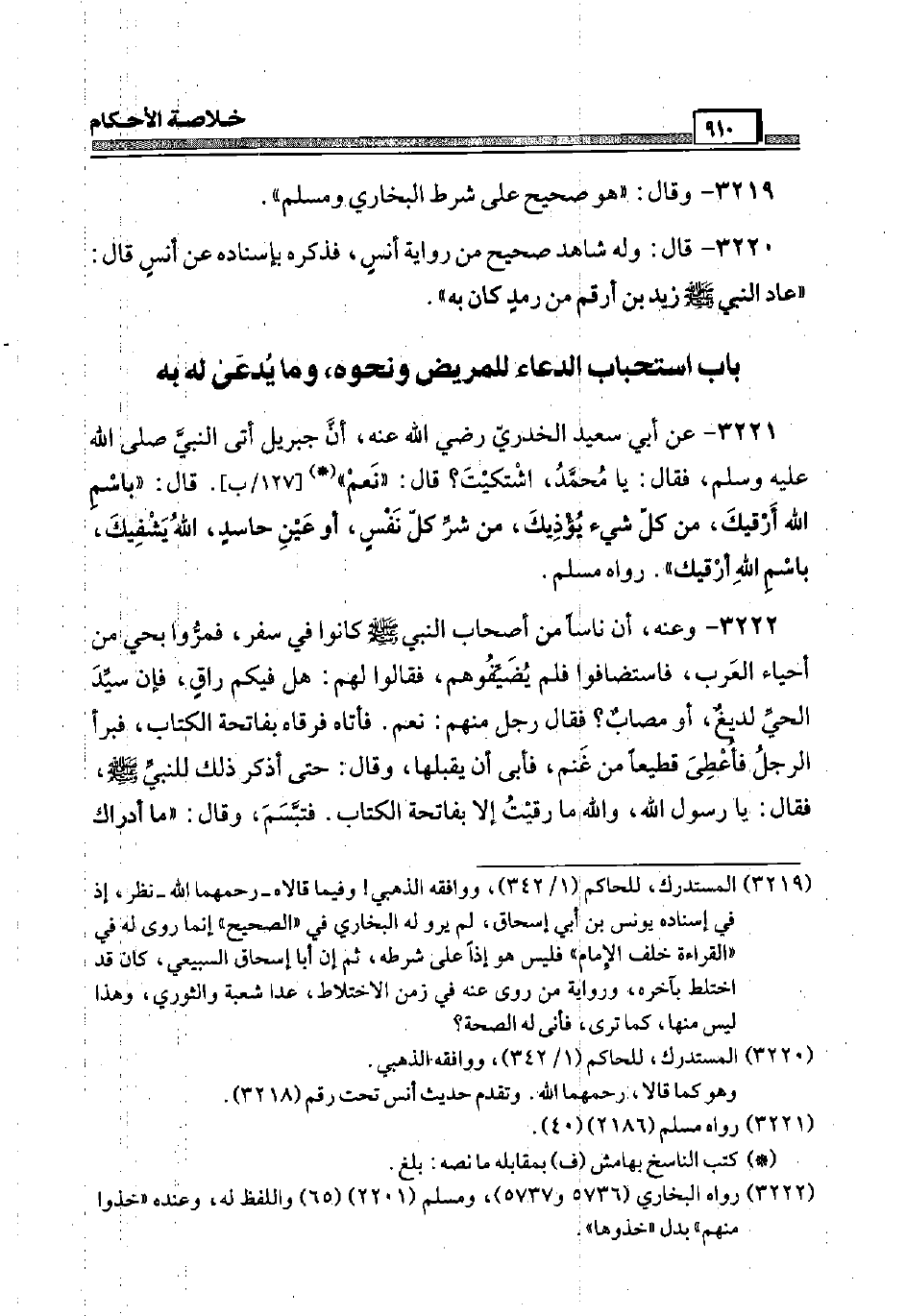 3221 - عَن أبي سعيد الْخُدْرِيّ رَضِيَ اللَّهُ عَنْه، أَن جِبْرِيل أَتَى النَّبِي صَلَّى اللَّهُ عَلَيْهِ وَسَلَّم َ، فَقَالَ: يَا مُحَمَّد، اشتكيت؟ قَالَ: " نعم " [127 / ب] . قَالَ: " باسم الله أرقيك، من كل شَيْء يُؤْذِيك، من شَرّ كل نَفْس، أَو عين حَاسِد، الله يشفيك، باسم الله أرقيك ". رَوَاهُ مُسلم.