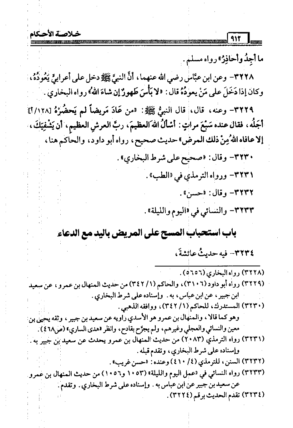 3229 - وَعنهُ، قَالَ، قَالَ النَّبِي صَلَّى اللَّهُ عَلَيْهِ وَسَلَّم َ: " من عَاد مَرِيضا لم يحضرهُ [128 / أ] أَجله، فَقَالَ عِنْده سبع مَرَّات: أسأَل الله الْعَظِيم، رب الْعَرْش الْعَظِيم، أَن يشفيك، إِلَّا عافاه الله من ذَلِك الْمَرَض " حَدِيث صَحِيح، رَوَاهُ أَبُو دَاوُد، وَالْحَاكِم هُنَا.