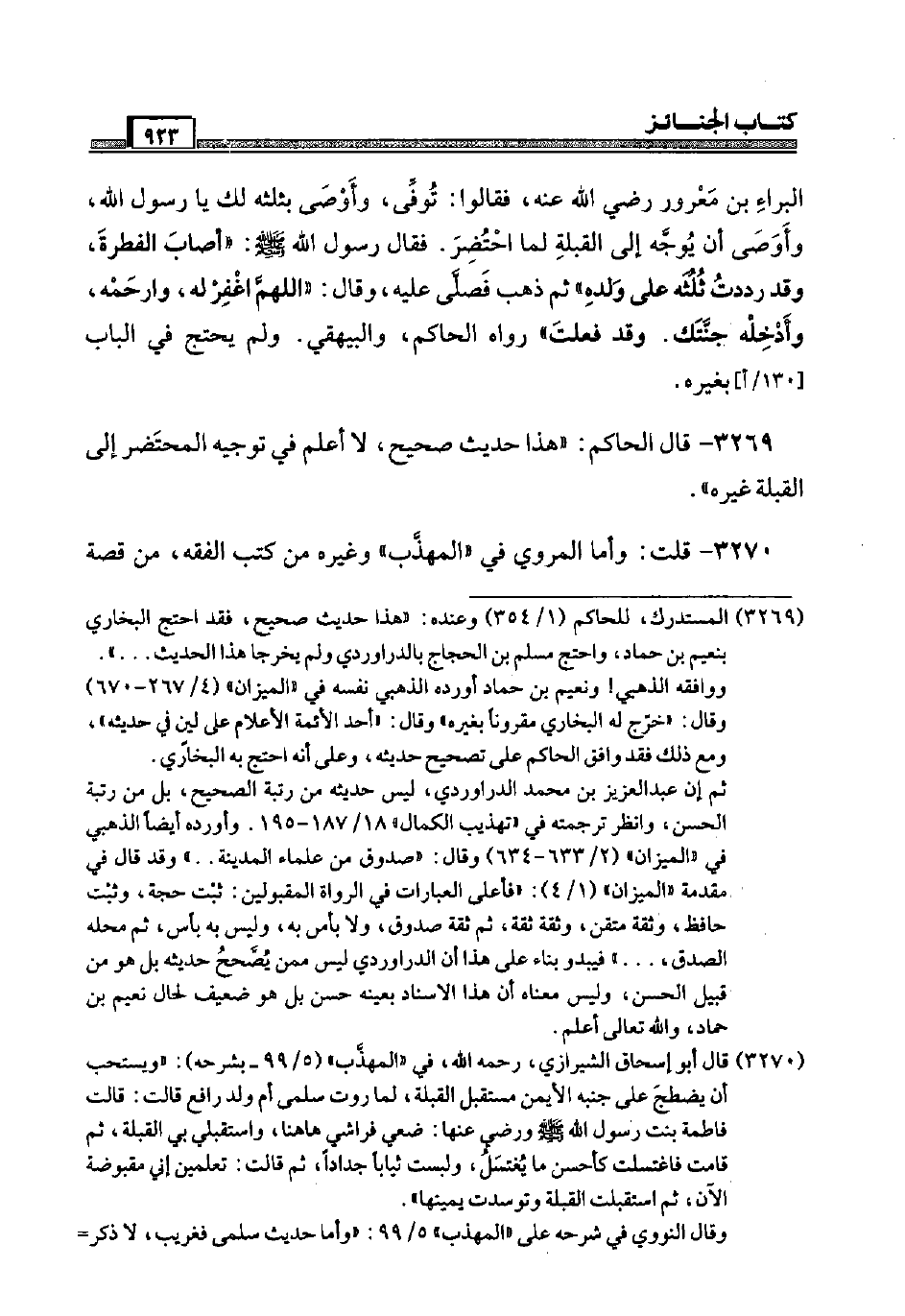 3269 - قَالَ الْحَاكِم: " هَذَا حَدِيث صَحِيح، لَا أعلم فِي تَوْجِيه المحتضر إِلَى الْقبْلَة غَيره ".