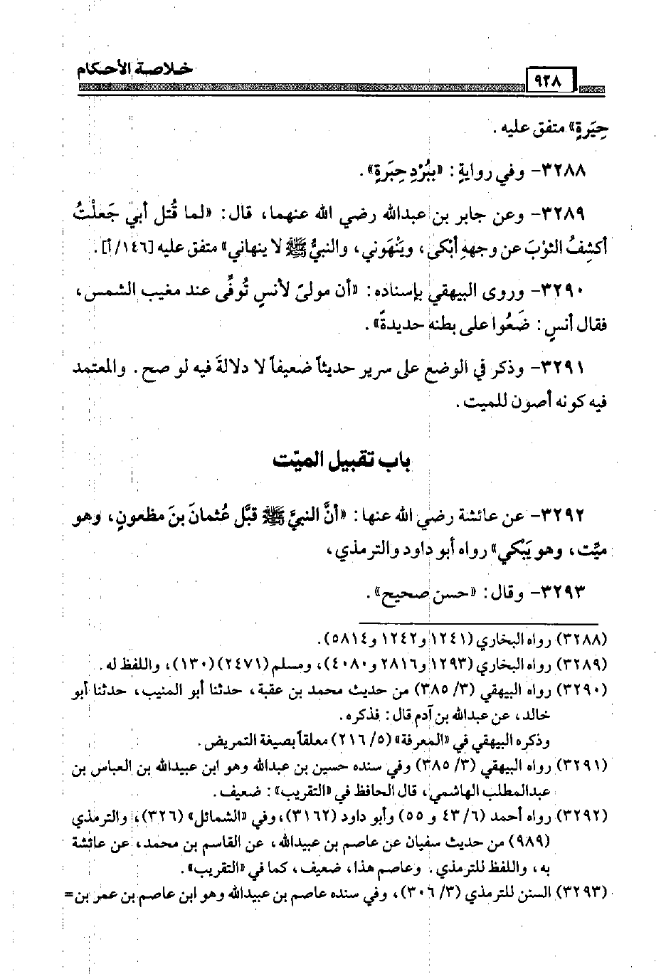3292 - عَن عَائِشَة رَضِيَ اللَّهُ عَنْها: " أَن النَّبِي صَلَّى اللَّهُ عَلَيْهِ وَسَلَّم َ قبَّل عُثْمَان بن مَظْعُون، وَهُوَ ميت، وَهُوَ يبكي " رَوَاهُ أَبُو دَاوُد وَالتِّرْمِذِيّ،