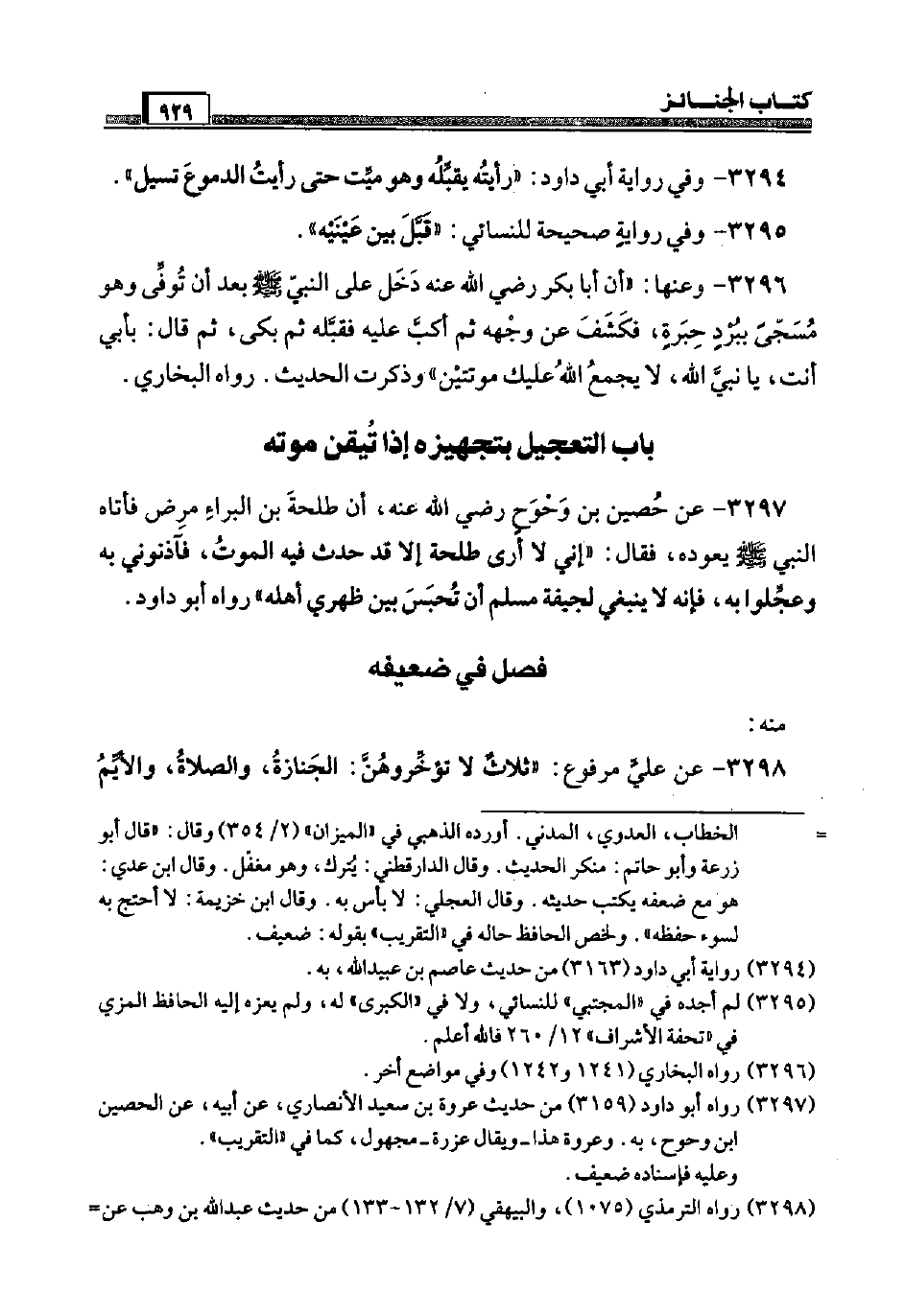 3297 - عَن حُصين بن وحْوح رَضِيَ اللَّهُ عَنْه، أَن طَلْحَة بن الْبَراء مرض فَأَتَاهُ النَّبِي صَلَّى اللَّهُ عَلَيْهِ وَسَلَّم َ يعودهُ، فَقَالَ: " إِنِّي لَا أرَى طَلْحَة إِلَّا قد حدث فِيهِ الْمَوْت، فآذنوني بِهِ وعجِّلوا بِهِ، فَإِنَّهُ لَا يَنْبَغِي لجيفة مُسلم أَن تُحبس بَين ظَهْري أَهله " رَوَاهُ أَبُو دَاوُد.