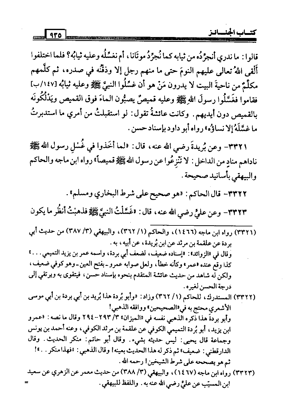 3321 - وَعَن بُرَيْدَة رَضِيَ اللَّهُ عَنْه، قَالَ: " لما أخذُوا فِي غسل رَسُول الله صَلَّى اللَّهُ عَلَيْهِ وَسَلَّم َ ناداهم مُنَاد من الدَّاخِل: لَا تنزعوا عَن رَسُول الله صَلَّى اللَّهُ عَلَيْهِ وَسَلَّم َ قَمِيصًا " رَوَاهُ ابْن مَاجَه وَالْحَاكِم وَالْبَيْهَقِيّ بأسانيد صَحِيحَة.