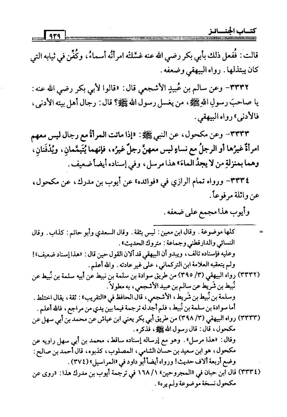 3333 - وَعَن مَكْحُول، عَن النَّبِي صَلَّى اللَّهُ عَلَيْهِ وَسَلَّم َ: " إِذا مَاتَت الْمَرْأَة مَعَ رجال لَيْسَ مَعَهم امْرَأَة غَيرهَا أَو الرجل مَعَ نسَاء لَيْسَ مَعَهُنَّ رجل غَيره، فَإِنَّهُمَا يُتيمَّمان، ويُدفنان، وهما بِمَنْزِلَة من لَا يجد المَاء " هَذَا مُرْسل، وَفِي إِسْنَاده أَيْضا ضَعِيف.