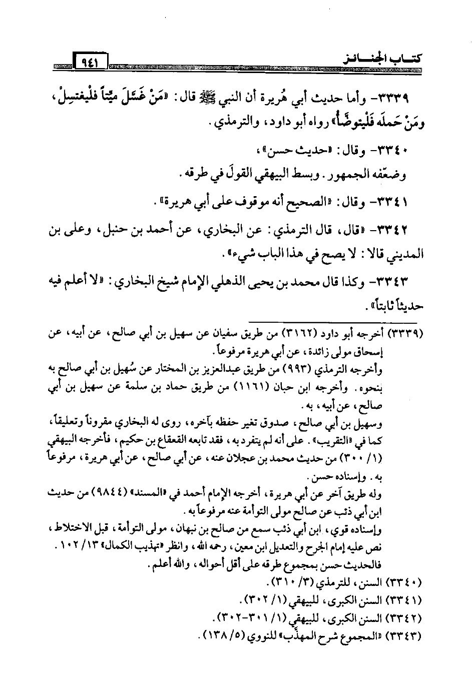 3339 - وَأما حَدِيث أبي هُرَيْرَة أَن النَّبِي صَلَّى اللَّهُ عَلَيْهِ وَسَلَّم َ قَالَ: " من غسّل مَيتا فليغتسل، وَمن حمله فَليَتَوَضَّأ " رَوَاهُ أَبُو دَاوُد، وَالتِّرْمِذِيّ.