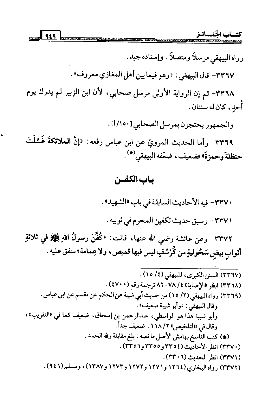 3369 - وَأما الحَدِيث الْمَرْوِيّ عَن ابْن عَبَّاس رَفعه: " إِن الْمَلَائِكَة غسّلت حَنْظَلَة وَحَمْزَة " فضعيف، ضعفه الْبَيْهَقِيّ.