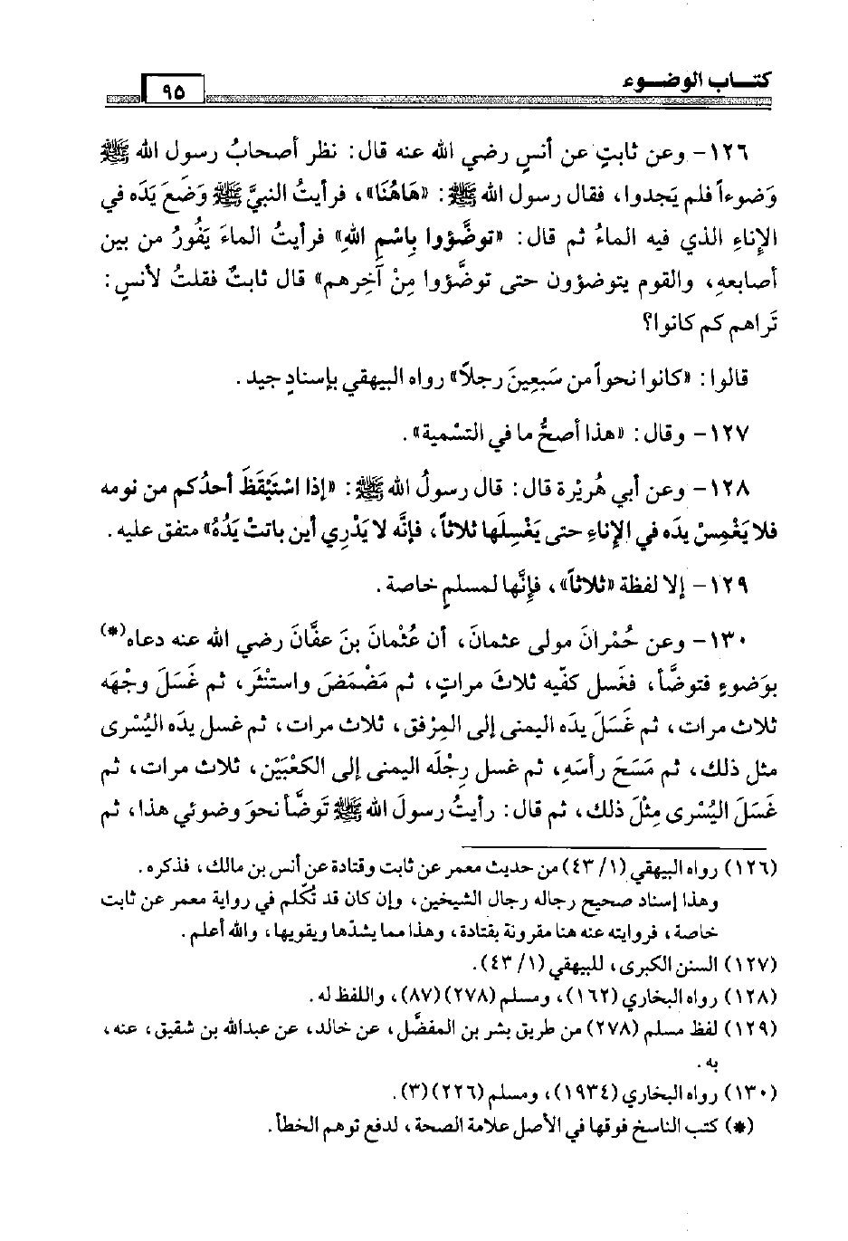 126 - وَعَن ثَابت عَن أنس رَضِيَ اللَّهُ عَنْه قَالَ: نظر أَصْحَاب رَسُول الله صَلَّى اللَّهُ عَلَيْهِ وَسَلَّم َ وضُوءًا فَلم يَجدوا، فَقَالَ رَسُول الله صَلَّى اللَّهُ عَلَيْهِ وَسَلَّم َ: " هَاهُنَا "، فَرَأَيْت النَّبِي صَلَّى اللَّهُ عَلَيْهِ وَسَلَّم َ وضع يَده فِي الْإِنَاء الَّذِي فِيهِ المَاء ثمَّ قَالَ: " توضؤوا باسم الله " فَرَأَيْت المَاء يفور من بَين أَصَابِعه، وَالْقَوْم يتوضؤون حَتَّى توضؤوا من آخِرهم " قَالَ ثَابت فَقلت لأنس: تراهم كم كَانُوا؟ قَالُوا: " كَانُوا نَحوا من سبعين رجلا " رَوَاهُ الْبَيْهَقِيّ بِإِسْنَاد جيد.