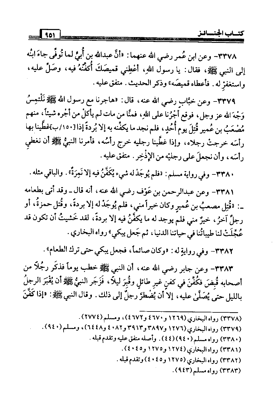 3378 - وَعَن ابْن عمر رَضِيَ اللَّهُ عَنْهما: " أَن عبد الله بن أبي لما توفّي جَاءَ ابْنه إِلَى النَّبِي صَلَّى اللَّهُ عَلَيْهِ وَسَلَّم َ، فَقَالَ: يَا رَسُول الله، أَعْطِنِي قَمِيصك أكَفنهُ فِيهِ، وصل عَلَيْهِ، واستغفر لَهُ. فَأعْطَاهُ قَمِيصه " وَذكر الحَدِيث. مُتَّفق عَلَيْهِ.